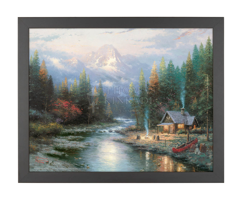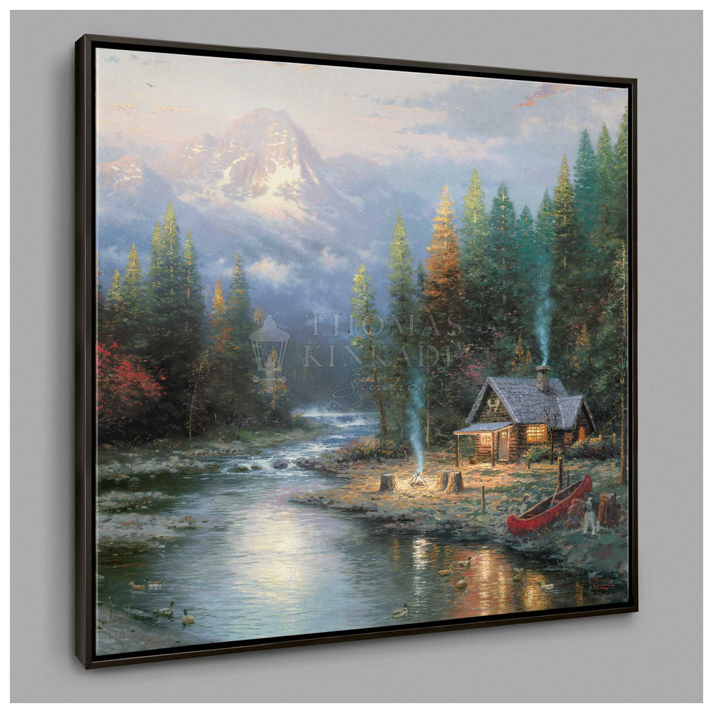 In A Quiet Evening at Riverlodge, second in my End of a Perfect Day collection, we visit a cozy, rustic cabin nestled in a setting rich with natural drama. A campfire stands at the ready; soon a company of weary fishermen will gather about the fire, swapping outlandish stories about the one that got away. Now that truly is the perfect end to a perfect day!