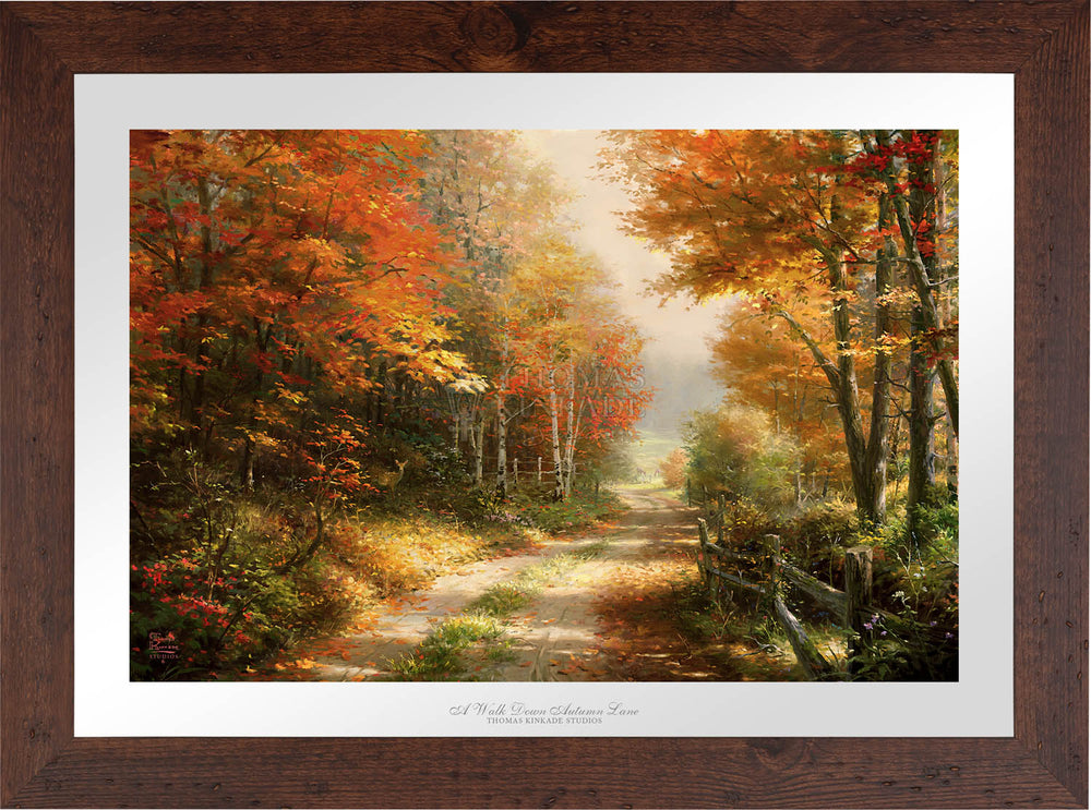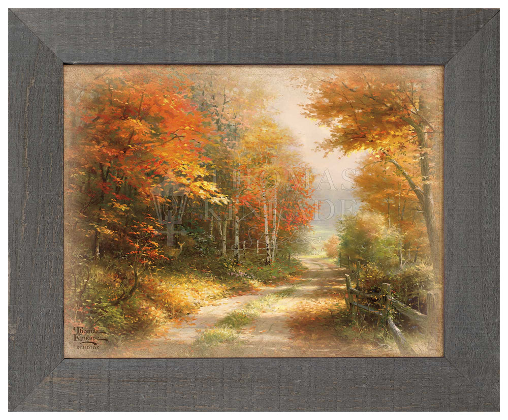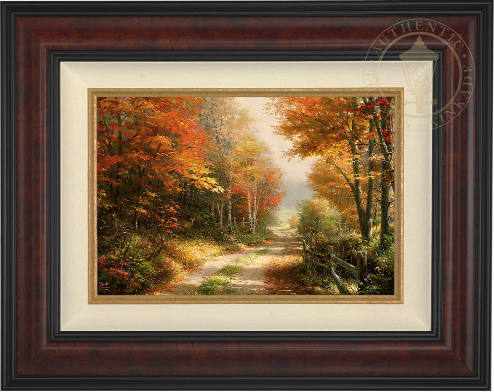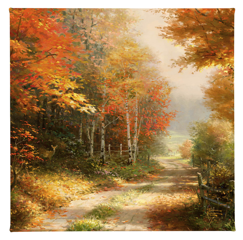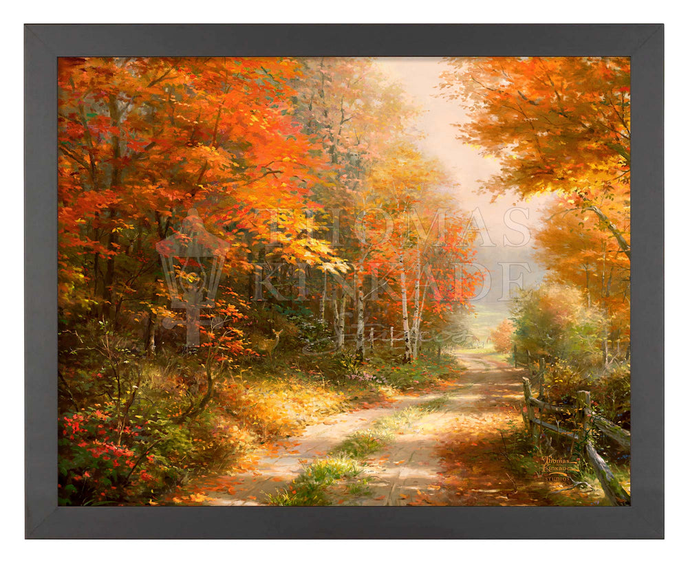A Walk Down Autumn Lane continues down the cool depths of the rural road that Thomas Kinkade perfectly depicted in his fiery piece Autumn Lane . Now over a decade later, the overgrown lane is still rich with the pleasures of the season; long morning shadows stretch far into the untamed autumn forest, only broken up by the brilliant morning light that illuminates the countryside’s hidden gems.