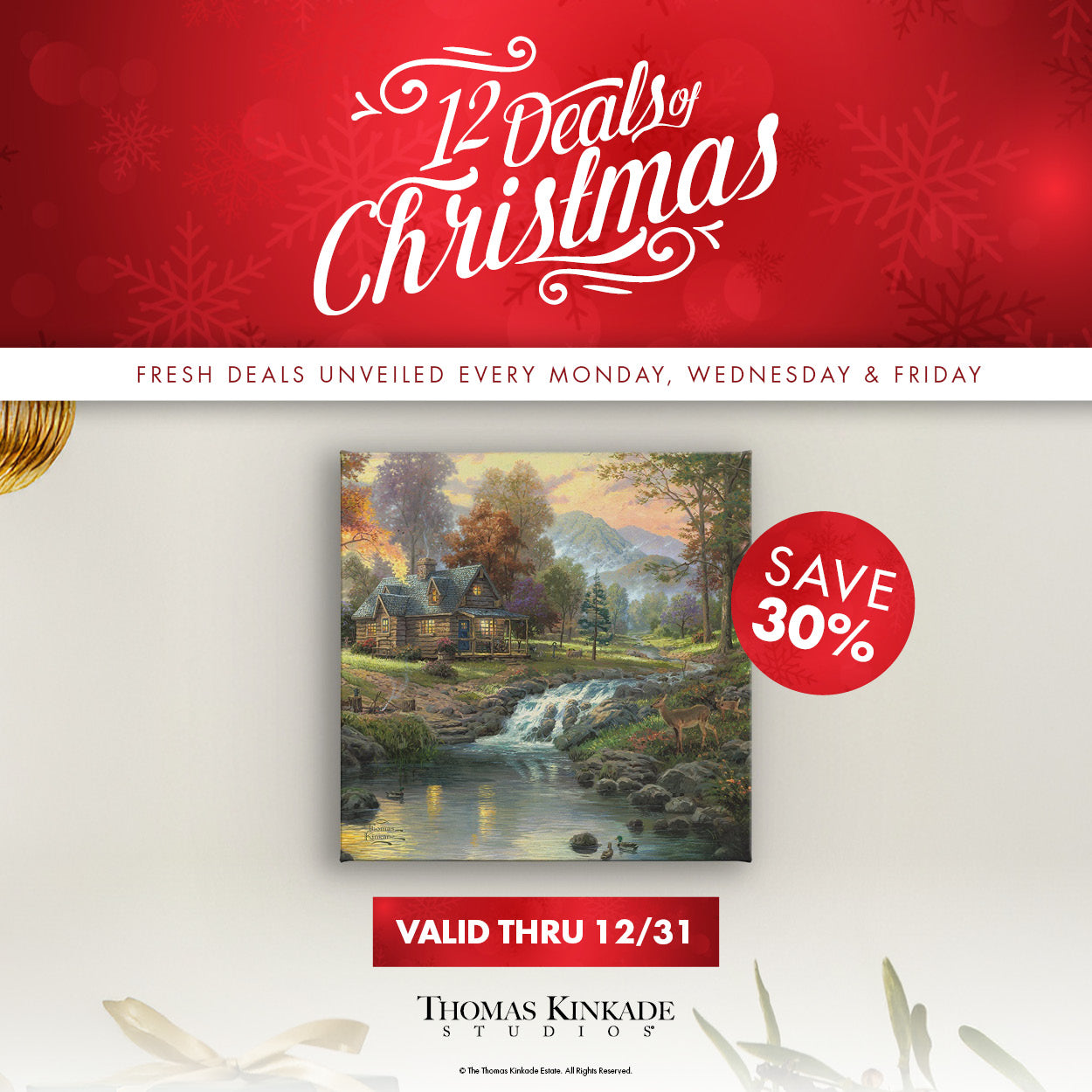 Join the festive fun as Thomas Kinkade Studios unveils exclusive deals every Monday, Wednesday and Friday from November 24th to December 19th during the 12 Deals of Christmas! Don't miss out on these limited-time treasures that promise to add a touch of holiday magic to your décor and gift-giving.