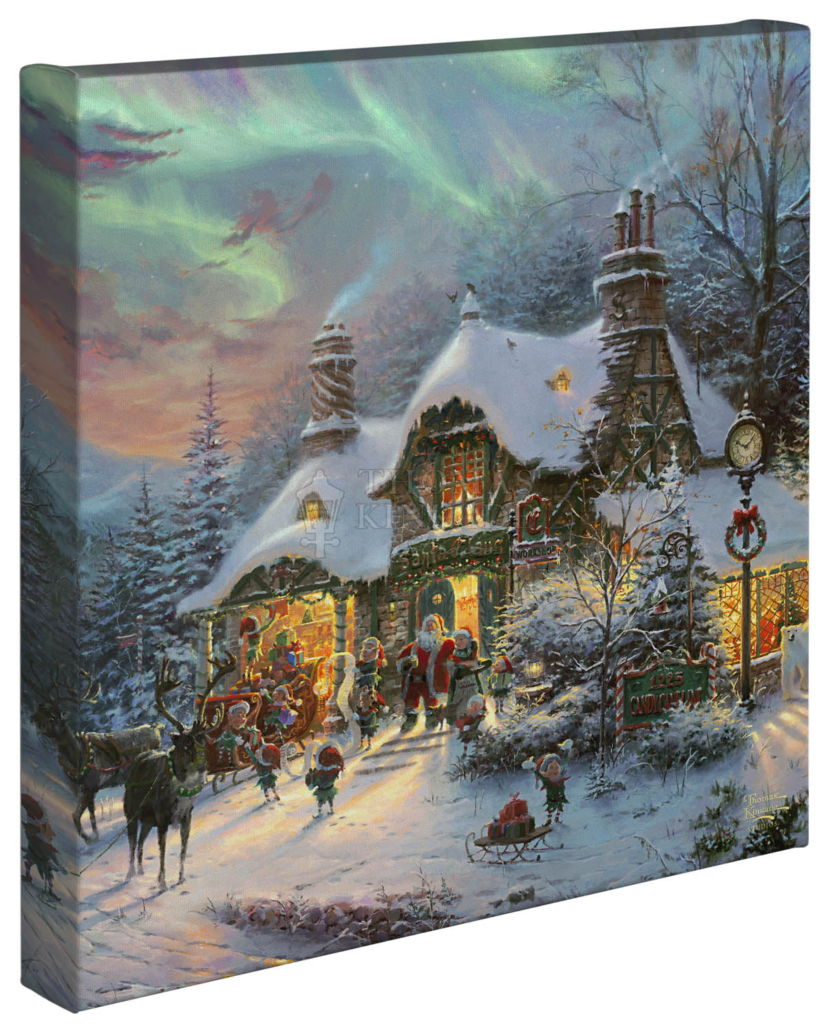 In Santa’s Night Before Christmas by Thomas Kinkade Studios, excitement is in the air as Santa’s elves pack his sleigh with presents to deliver to all the good children of the world. For the entire year, the residents of the North Pole have been joyfully working around the clock to get ready for Christmas Eve. As the time for departure approaches, the brilliant northern lights have lit up the sky with a dazzling display of auroral light; creating the perfect scene to start Santa’s magical journey.Product Specifications