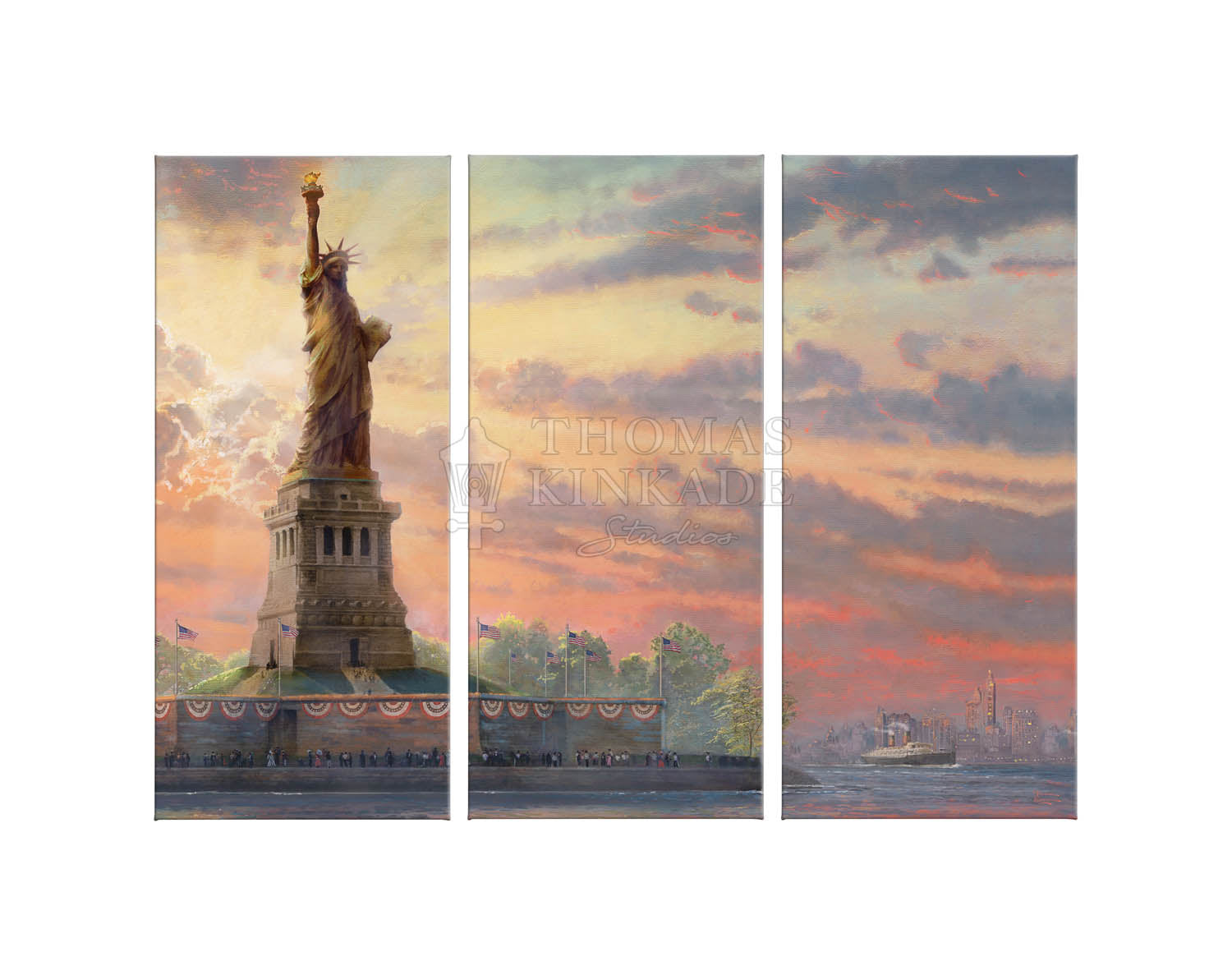 Thomas Kinkade loved America. From its many beauties to its great freedoms, Thom regularly sought to capture the spirit and heart of our great country on canvas. Nowhere is that seen more clearly than in this painting from the Thomas Kinkade Studios, celebrating the symbol of freedom and democracy, the Statue of Liberty.