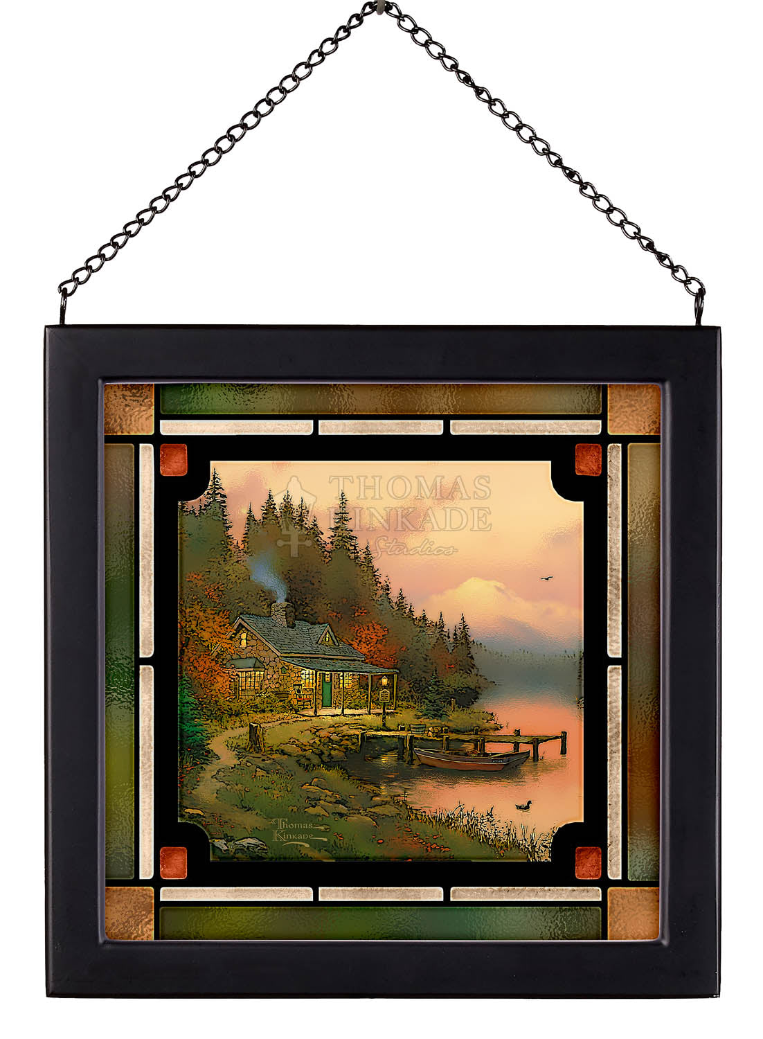 Let the light shine! Stained glass art hangings show their true colors when back-lit with natural sunlight. Classic images by Thomas Kinkade Studios are printed with fade resistant inks directly on glass, framed, and ready to hang.