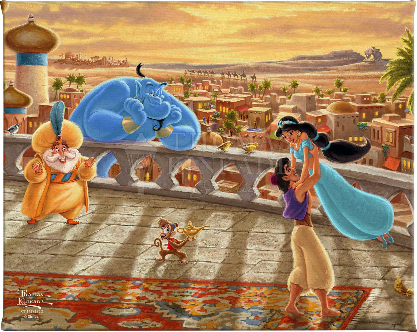 A floral fragrance fills the warm desert air and the soft wind blows, creating a beautiful melodic harmony. A tune floats on the wind as love blossoms between Disney’s Aladdin and Princess Jasmine. The setting sun casts a romantic glow over the kingdom of Agrabah as Aladdin twirls Jasmine around the palace balcony. Jasmine’s father, The Sultan, gazes fondly and with the pleasure of watching his daughter find everlasting love. Genie, Abu, and the Magic Carpet are happy to watch the young love develop. Protective Rajah appears to ponder the pair, and only wants happiness for his Princess Jasmine. Thomas Kinkade Studios is proud to present Jasmine Dancing in the Desert Sunset. An inspired work of art depicting the magic moments of finding true love.Product Specifications