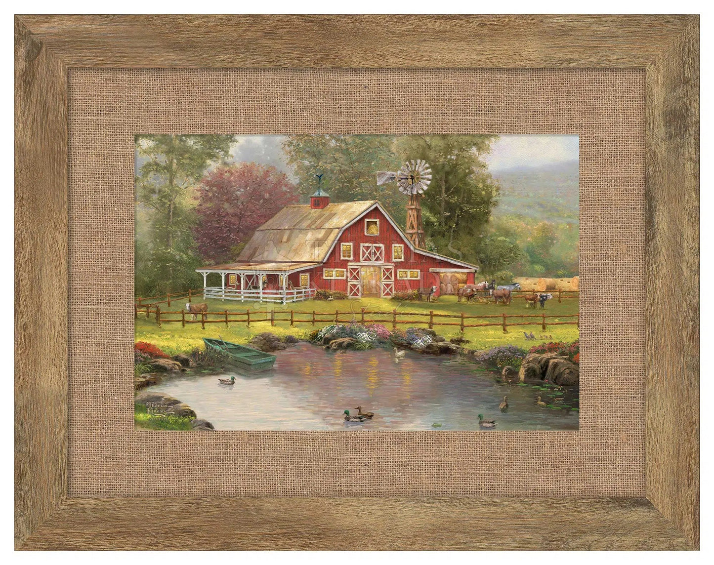 “The great secret of farm life is that, for all its demands, it returns a gift of precious serenity.” – Thomas Kinkade A walk on a farm brings a symphony of sights, smells and sounds to the senses. The aroma of fresh mowed hay, the whinnying of horses, and the abundance of baby animals is sure to bring a smile to everyone’s faces. Thomas Kinkade grew up in farm country and the smell of new hay was a treasured memory of his. He always dreamed of owning his own slice of heaven one day. Thomas Kinkade Studios sought to capture Thom’s vision of the pastoral life. In this painting, morning light filters through the trees casting a warm glow onto the farm. The horses and cows are milling about waiting to be turned out to the pastures after being fed. The ducks, chickens, bunnies and dogs are happily starting their day. Thomas Kinkade Studios is pleased to present Red Barn Retreat, where we all discover the sweet smell of hay and something more – a sense of perfect tranquility.Product Specifications