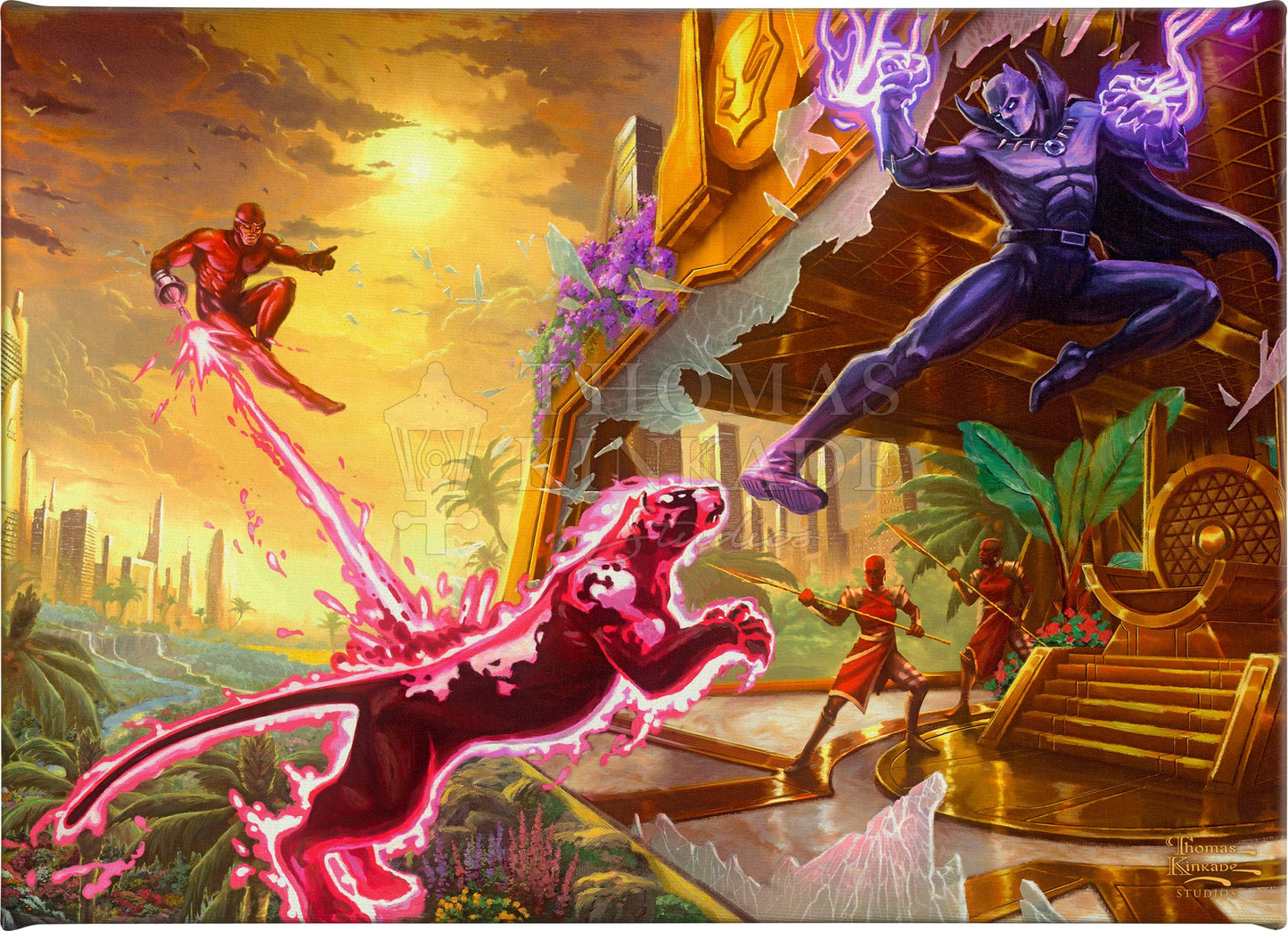 The nation of Wakanda is now protected by T’Challa, the new king in a long legacy of Black Panther warriors that protect their people. In the evening sky, Klaw hovers above Wakanda sonically empowering his insidiously lethal and ironic creation to attack our hero, Black Panther. The Dora Milaje, elite female warriors known as the adored ones, stand at the ready to protect the protector, T’Challa, from this new threat. Faced with treachery and danger and motivated by the memory of his father’s murder at the hands of this evil villain, Black Panther is ready to do battle with his archenemy and secure the safety of his people. Thomas Kinkade Studios proudly presents its new Marvel Comics collaboration: Black Panther.