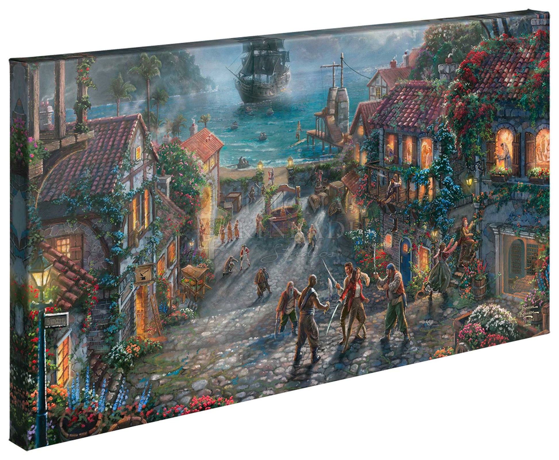 From the first moments we climb into our boat on the Pirates of the Caribbean ride singing, "It's a pirates life for me," or view those wondrous opening frames of any of the Pirates' movies, we are captivated by the spirit of adventure mixed with romance. It's a fun adventure filled with memorable moments. Captain Jack Sparrow makes his grand entrance as his ship slowly sinks in the harbor of a portside town. A mischievous mutt can be seen taunting pirate prisoners. Will and Elizabeth are fighting pirates back-to-back while resisting the inevitable pull of true love. In Pirates of the Caribbean, The Curse of the Black Pearl, the Thomas Kinkade Studios celebrate these iconic characters and films, which so vividly remind us of a life of passion and adventure.Product Specifications