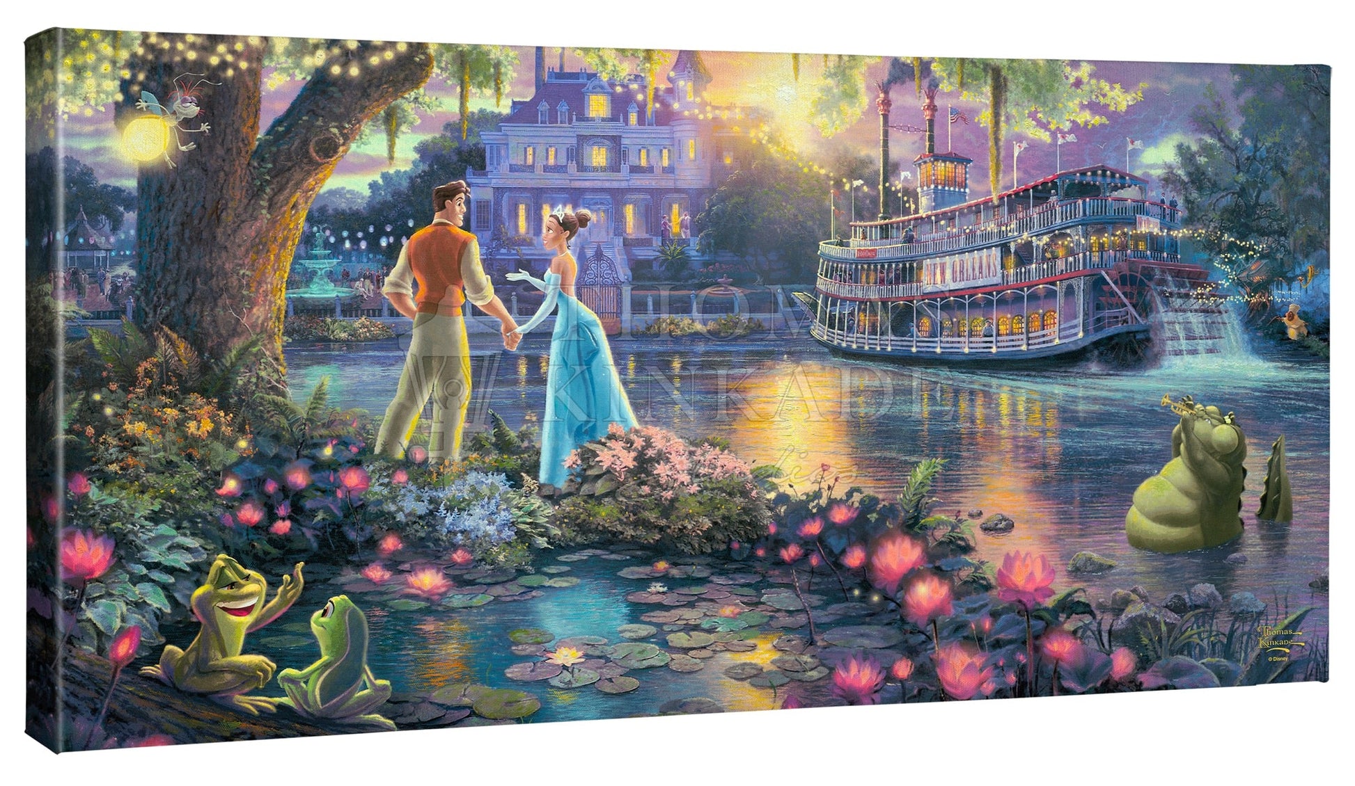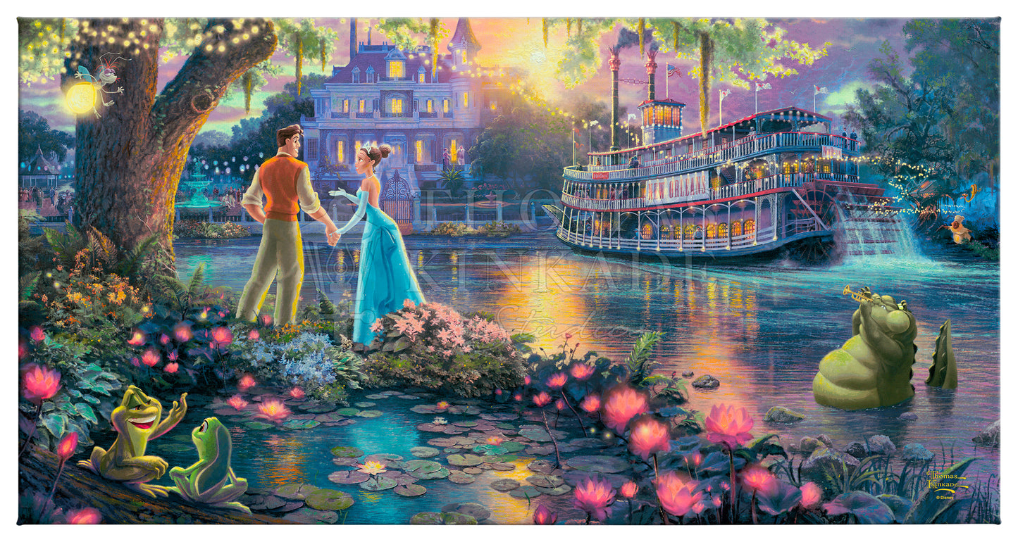 As the first piece in my Disney Discoveries Collection, The Princess and the Frog will no doubt experience an enthusiastic welcome by Disney and Kinkade fans worldwide. At its core, The Princess and the Frog painting, like the movie itself, portrays a romantic love story. And who can resist a love story?