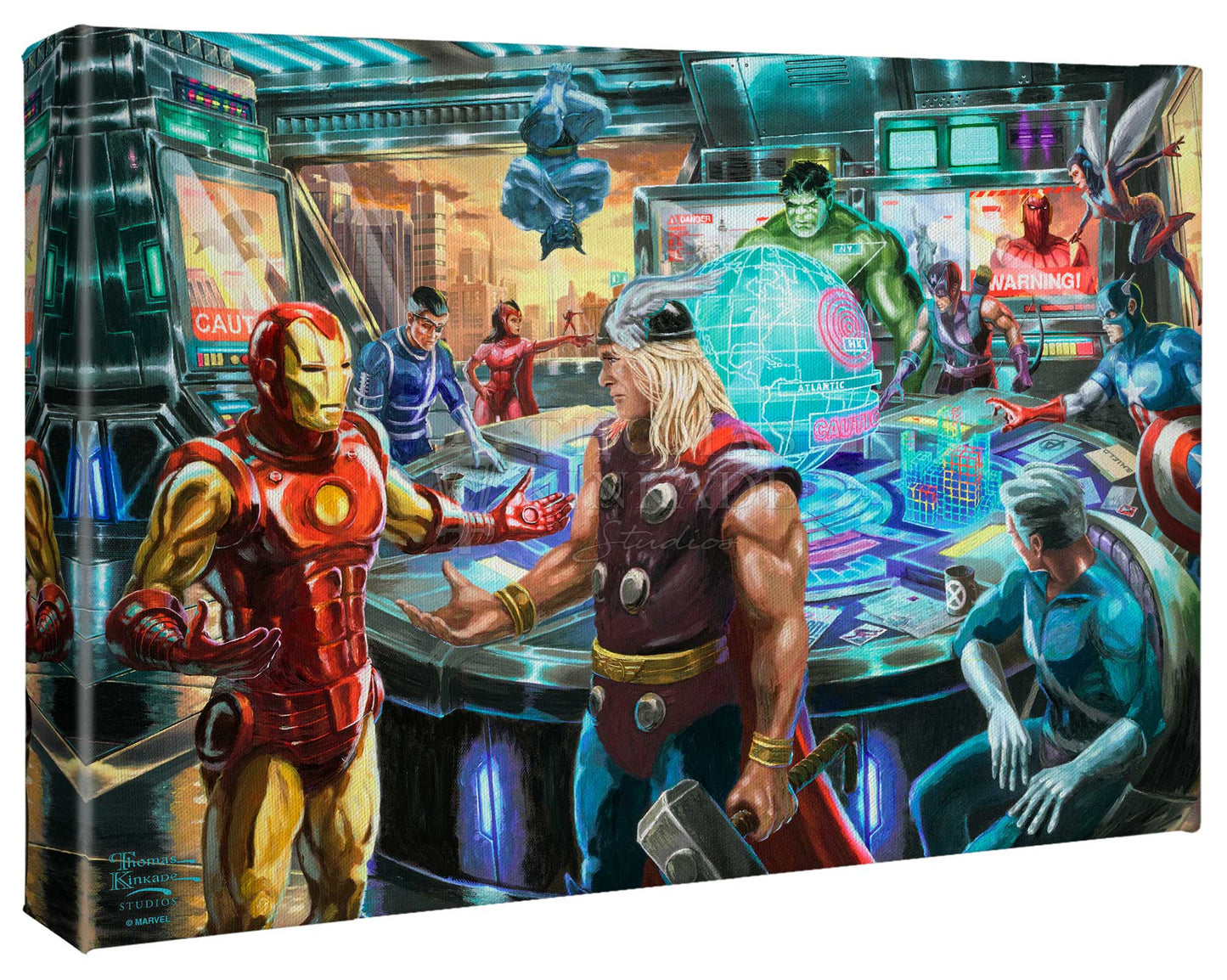 “Earth’s Mightiest Heroes” are gathered inside the Avengers Mansion formulating a plan to thwart the new threat by Thanos to Earth. The warning message of this pending attack appears on their monitors. Iron Man, Thor, the Hulk, Hawkeye, Ant-Man, Wasp, Captain America, the Scarlet Witch, Quicksilver, Vision, Beast and Nick Fury get ready for an epic battle against Thanos and the Black Order, combining their unique skills and leveraging their incredible power of teamwork. Thomas Kinkade Studios proudly presents its new Marvel Comics collaboration: The Avengers.Product Specifications