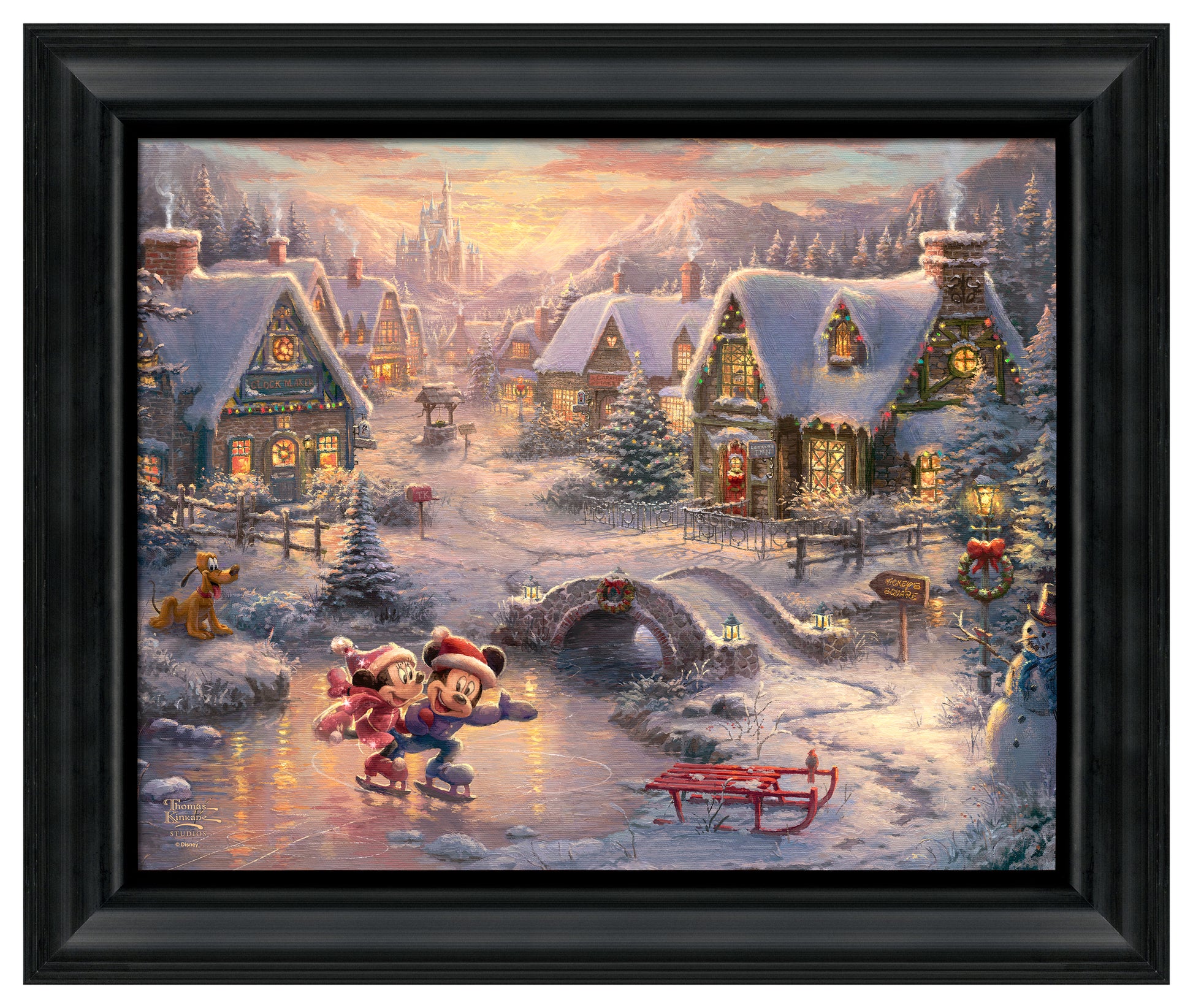In this beautiful winter scene, Mickey Mouse and Minnie Mouse joyfully skate across a frozen pond, celebrating the magic of the Holidays together. Along with their friends, they have festively decorated “Mickey’s Square” with lights, wreaths, bows, a snowman, and all that makes the Holidays bright! Although it is cold outside, the skaters are warmed by friendship and love as they enjoy the wonders of the season together.