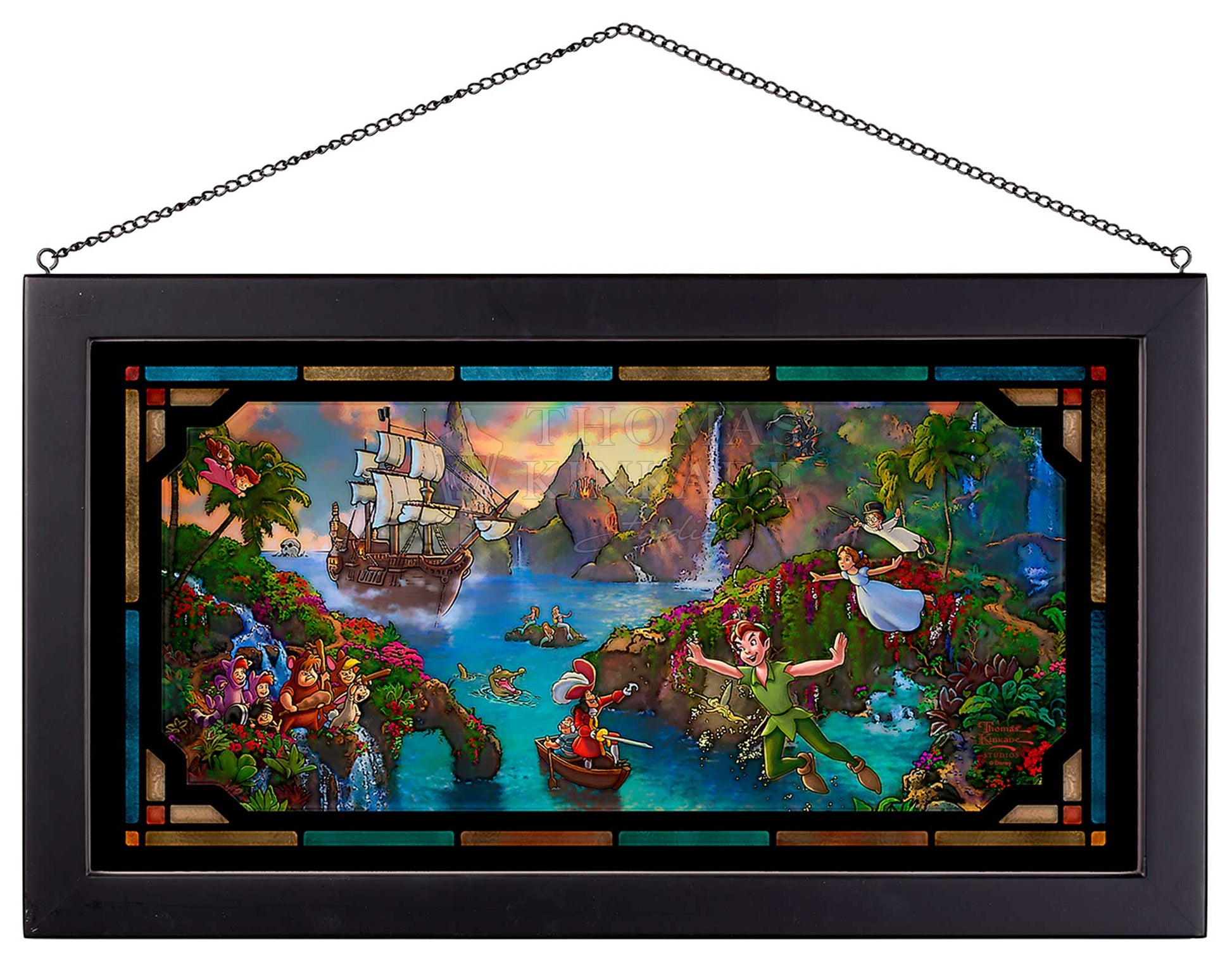 Peter Pan is a classic Disney film that celebrates the magic of childhood. In this tale, Wendy Darling and her brothers Michael and John join Peter Pan, Tinker Bell, and The Lost Boys on an exciting adventure that highlights how important it is to always use our imaginations and that nothing is impossible if we believe in it. The story also reinforces the fact that the power of a friendship can last a lifetime. Peter Pan's Never Land by Thomas Kinkade Studios captures the adventure of the magical place that Peter Pan and his friends call home. In this scene, we see Peter battling his nemesis Captain Hook, with the help of Wendy, Michael, John, The Lost Boys, and his beloved pal Tinker Bell. The friends fly together with faith and a dash of pixie dust, while the Mermaids look on and a beautiful rainbow sits brightly in the sky. This painting reminds us that although we may grow up, we should view the world with the wonderment of a child, no matter our age. It also reinforces the fact that the bonds of a true friendship can lift us up throughout our lives.