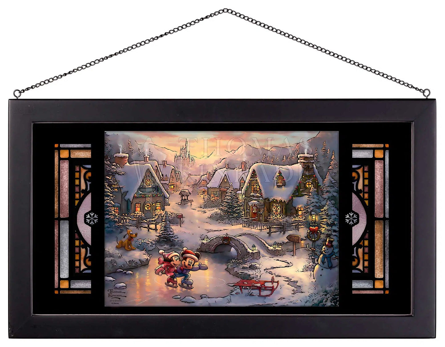 Thomas Kinkade was a life-long admirer of Walt Disney and the wonderful characters he created. While Thom re-created many of his favorite stories on canvas, he also envisioned classic Disney characters set within traditional Kinkade images. In these paintings from Thomas Kinkade Studios, his dream is proudly brought to life. In this beautiful winter scene, Mickey Mouse and Minnie Mouse joyfully skate across a frozen pond, celebrating the magic of the Holidays together. Along with their friends, they have festively decorated “Mickey’s Square” with lights, wreaths, bows, a snowman, and all that makes the Holidays bright! Although it is cold outside, the skaters are warmed by friendship and love as they enjoy the wonders of the season together. We wish you a Happy Holiday, and we hope that Mickey and Minnie – Sweetheart Holiday inspires you to create special memories with the important people in your life.