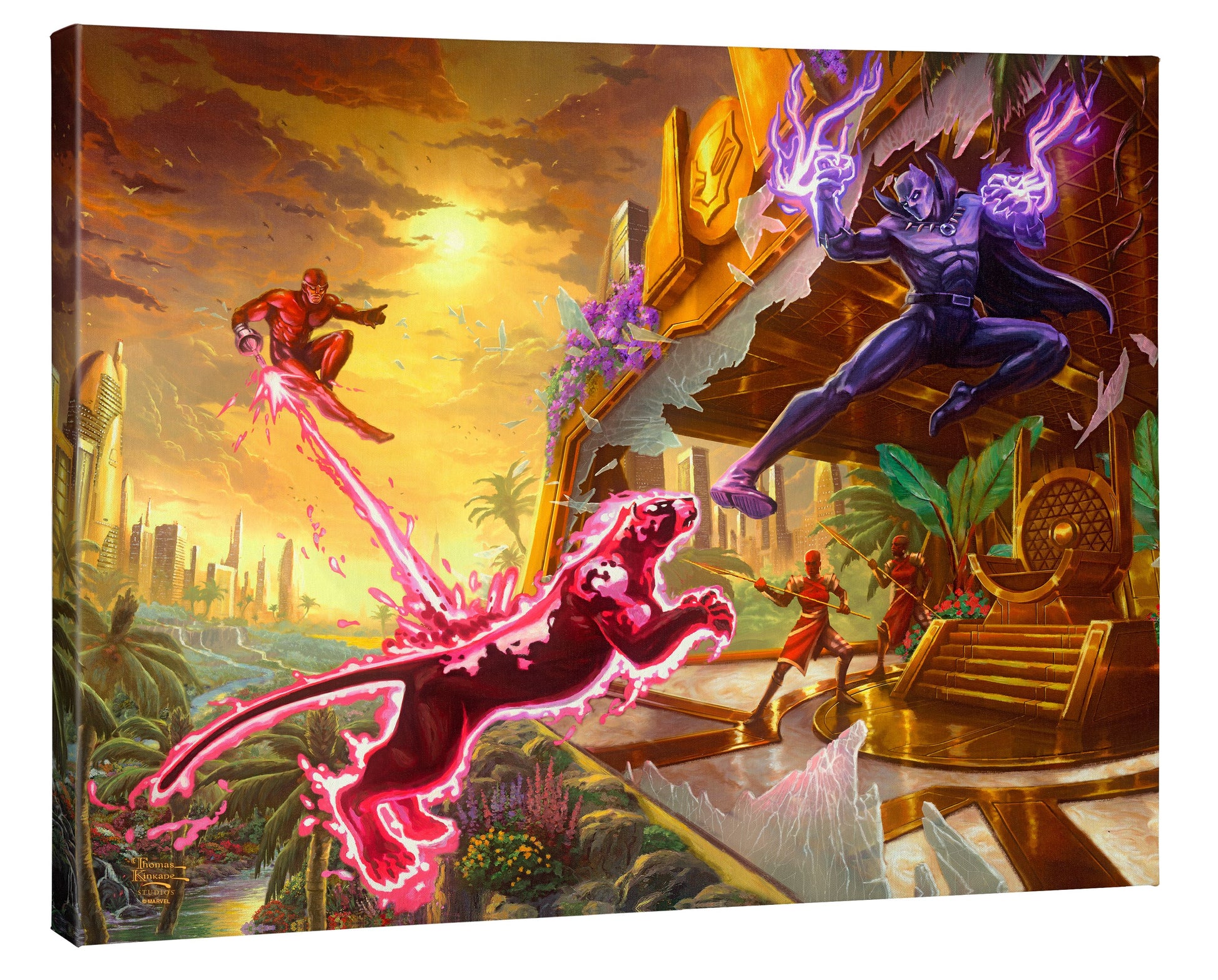 The nation of Wakanda is now protected by T’Challa, the new king in a long legacy of Black Panther warriors that protect their people. In the evening sky, Klaw hovers above Wakanda sonically empowering his insidiously lethal and ironic creation to attack our hero, Black Panther. The Dora Milaje, elite female warriors known as the adored ones, stand at the ready to protect the protector, T’Challa, from this new threat. Faced with treachery and danger and motivated by the memory of his father’s murder at the hands of this evil villain, Black Panther is ready to do battle with his archenemy and secure the safety of his people. Thomas Kinkade Studios proudly presents its new Marvel Comics collaboration: Black Panther.