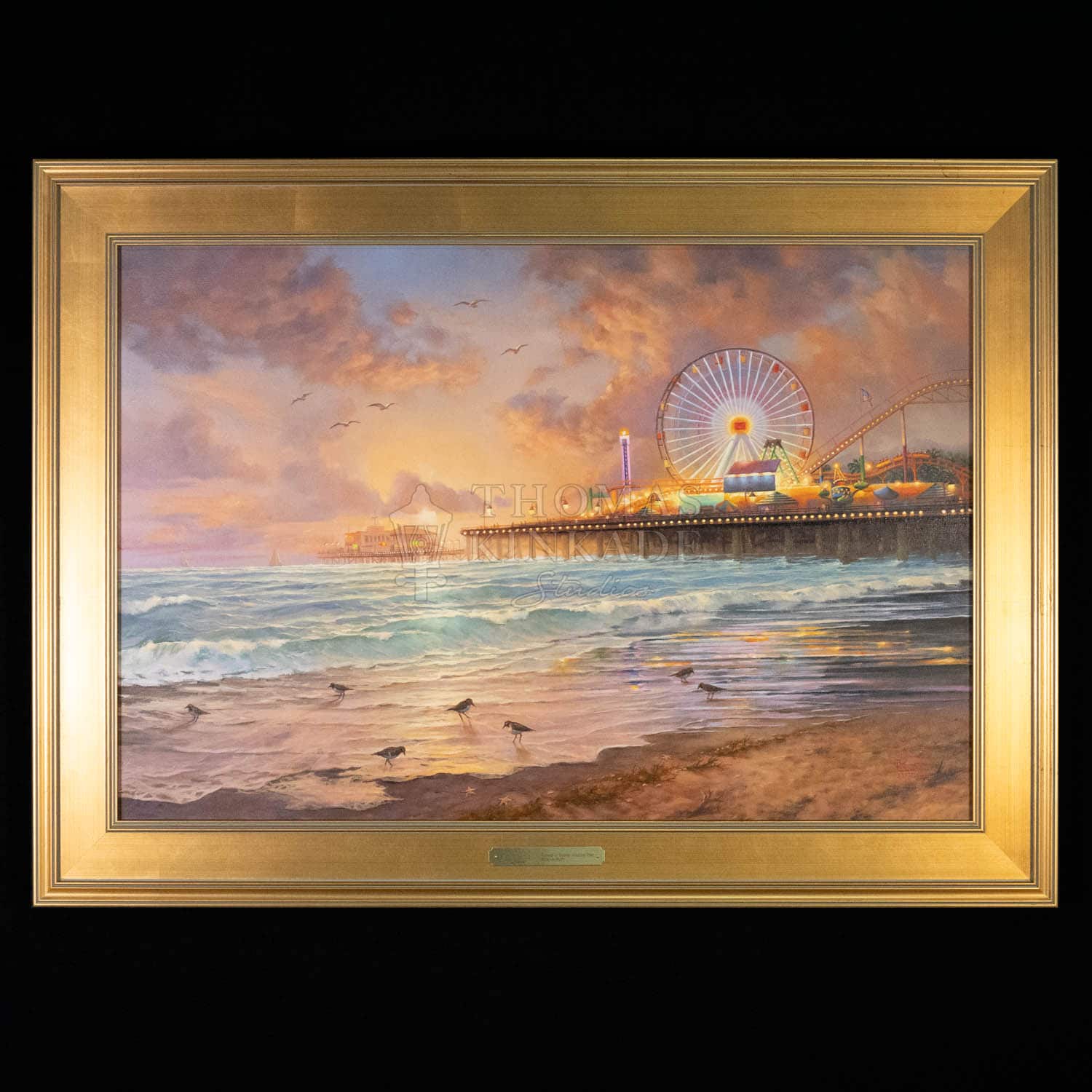 Call UsEvery traveler knows that they have arrived in Santa Monica, California when they see the Santa Monica Pier extending into the inviting waters of the Pacific Ocean with its historic amusement park and its iconic Ferris wheel, brightly lit, welcoming visitors with the promise of fun memories to be made. This historic landmark is known for its breathtaking view of the ocean and for the excitement and joy that it’s brought to visitors for over a century. Although many attractions have come and gone over the decades, the Santa Monica Pier and its adjacent Looff Hippodrome have remained – bastions of beauty and a nostalgic reminder to stop and enjoy life with the ones you love. If one stands perfectly still on the soft beach, reflecting on the colors emanating from the pier and listening to the calliope of sounds bouncing off the water, you will feel the harmonic embrace of man and nature. Thomas Kinkade Studios’ Sunset at Santa Monica Pier brings to life the vibrancy of the setting sun reflecting off the picturesque pier and the magical sounds of fun rolling across the ocean waves. This painting is a celebration of natural beauty and cherished family memories.