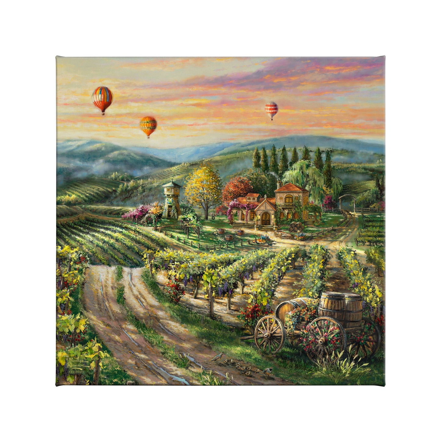 "God is truly the giver of all good gifts, and the natural process of growth and harvest each year throughout the globe testifies to this." – Thomas Kinkade The incredible fruitfulness of the good earth is symbolized in this blossoming vineyard. The rolling hills glow a verdant green in the sunshine, and the ubiquitous hot air balloons seem to drift lazily in the morning sky. The valley fog is retreating as the sun starts to shine brightly on the grapevines. The dogs head off on their day to keep the family's vineyard safe. Thomas Kinkade Studios invites you to walk down the road and enjoy a taste of Peaceful Valley Vineyard.Product Specifications