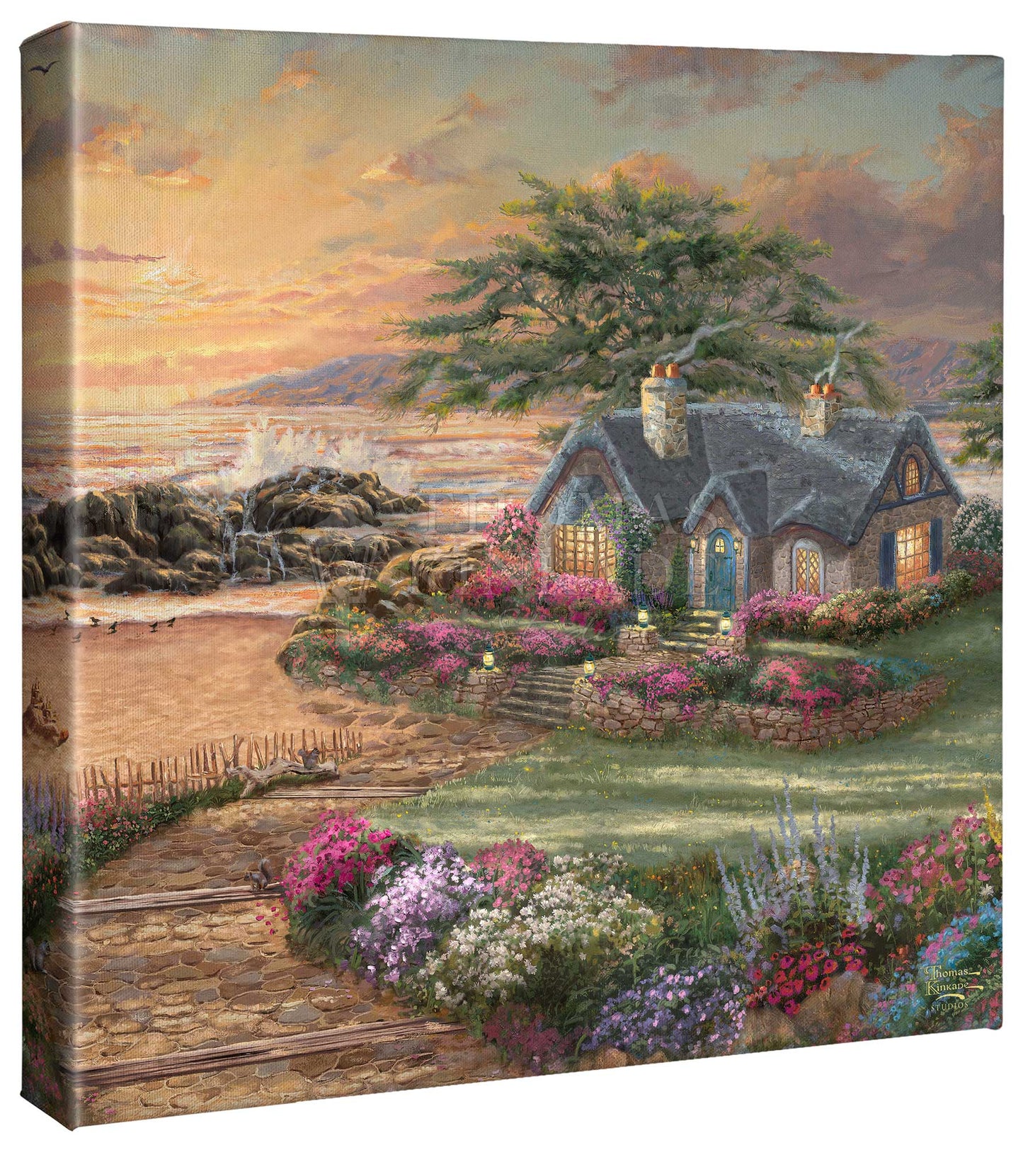 “The voice of the ocean speaks to the soul.” – Anonymous The enchanting setting sun radiates a warm glow as the ocean waves crash against the rocks on the seashore. The serenity of early evening fills the air, accented by the flowers’ beauty, the vibrant sunset, and the tranquil beach. The splash of the water from the breaching whales will bring a smile to those who are lucky to have witnessed their passing travels. The inviting cottage with its welcoming lights is the perfect place to enjoy Nature. Thomas Kinkade Studios presents Seaside Cottage, an idyllic sanctuary for all to refresh their faith, spirit, and soul.
