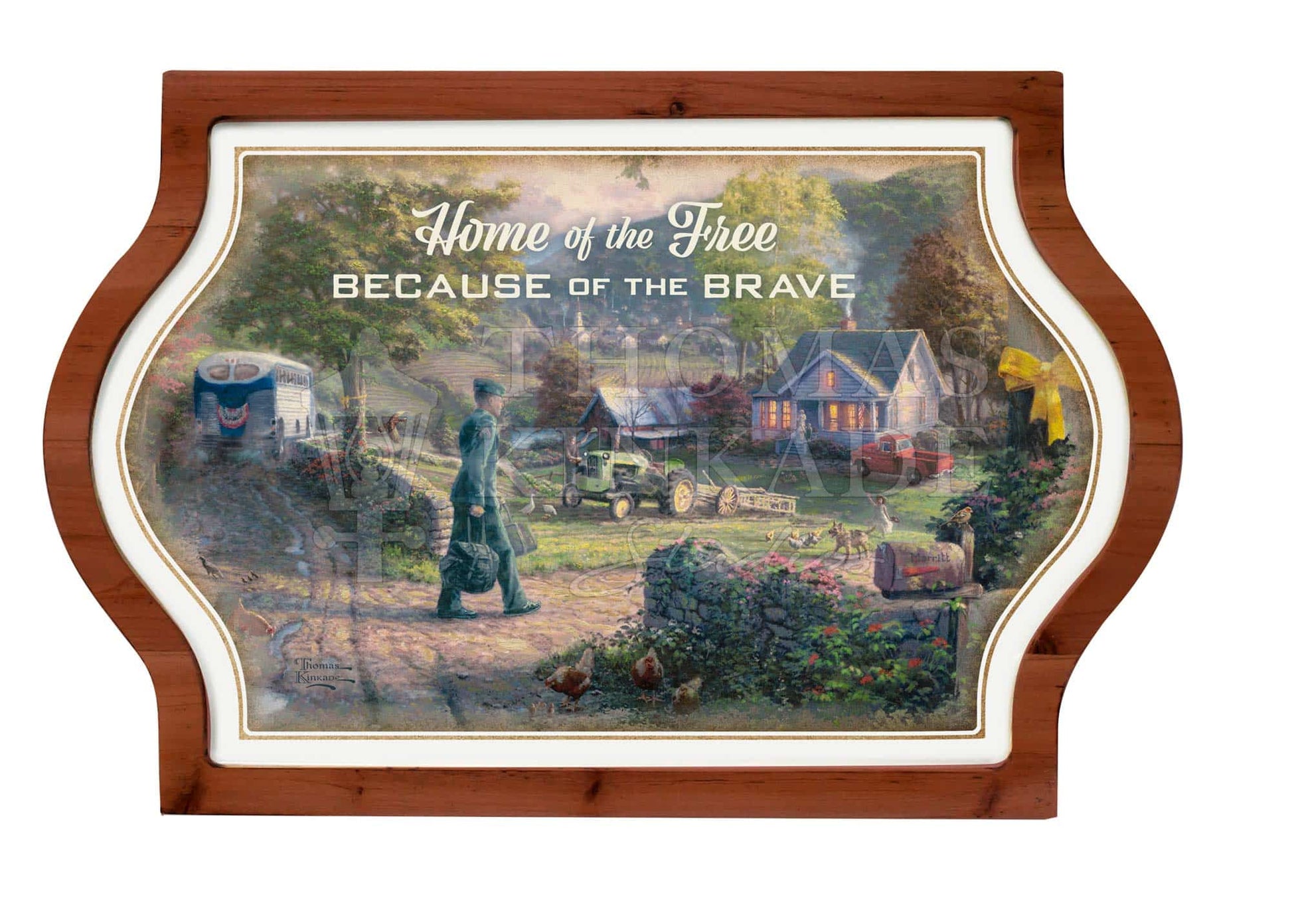 Our vintage framed signs feature artwork from your favorite artist. Thomas Kinkade Studios art is printed onto Die-cut metal and framed in an old fashion vintage shape. You can display this piece indoors or in a sheltered outdoor area.