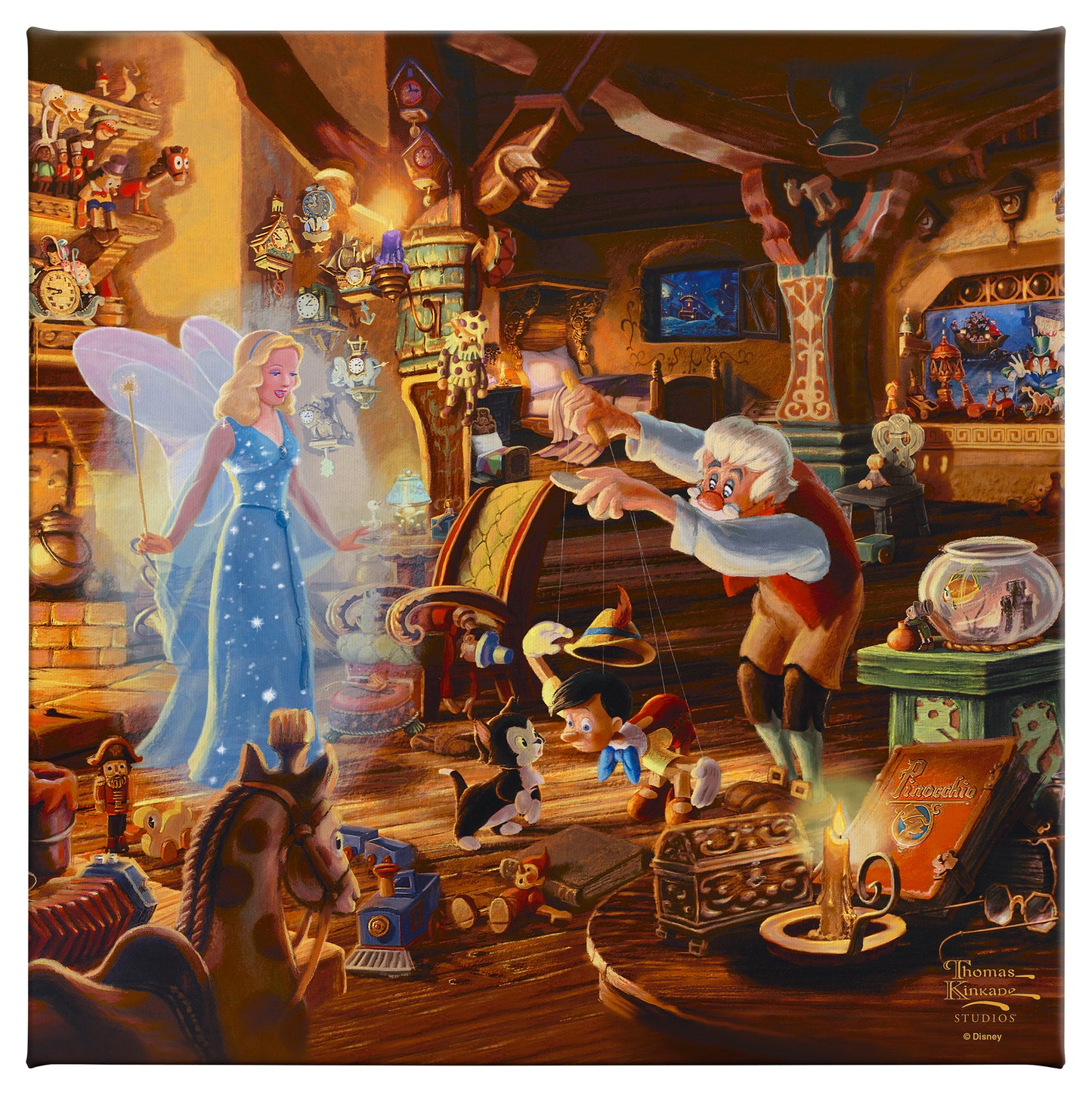 At some time in our lives, each one of us has wished upon a star, and a beautiful wish is where Geppetto’s dream takes shape for the little puppet boy he carved from wood. In the classic Disney film, Geppetto sees a shooting star and wishes the puppet would become a real boy – the son he always hoped for. As the night progresses, the Blue Fairy is poised to make this wish come true. The glow from the fire reflects on the faces of Jiminy Cricket and Cleo as they watch the sweet interaction of Figaro meeting Pinocchio for the very first time. Joy fills the workshop as Geppetto’s wish is granted. Thomas Kinkade Studios is pleased to present Disney Geppetto’s Pinocchio, art that uplifts us and reminds us that hopes and dreams can come true.Product Specifications