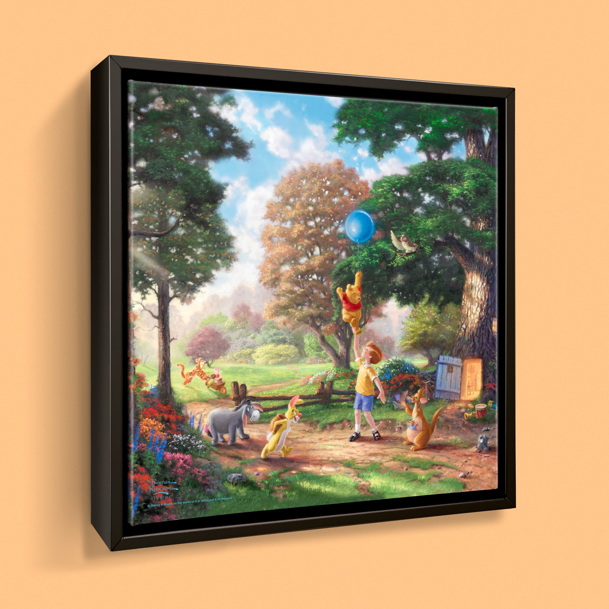 There are few if any works of literature or animation that better capture the innocence and wisdom of the child and the child's perspective on life than the A. A. Milne classic "Winnie the Pooh". There were few if any books or films that influenced Thom as a young boy more than these stories detailing the adventures of Christopher Robin and his delightful menagerie of friends as they all adventured in the Hundred Acre Wood. In 1966 when Disney Studios began releasing their featurettes chronicling these wondrous tales, Thom could not have been more excited. His childhood fancies were coming to life. It is in honor of that time in his life we at the Thomas Kinkade Studios proudly introduce scenes from this magical story of love, faith, friendship and adventure. It is in these paintings we hope our collectors reflect on and always remember these undeniable truths from Pooh himself, such as "nobody can be uncheered with a balloon" or "when you see someone putting on his Big Boots, you can be pretty sure that an adventure is going to happen."