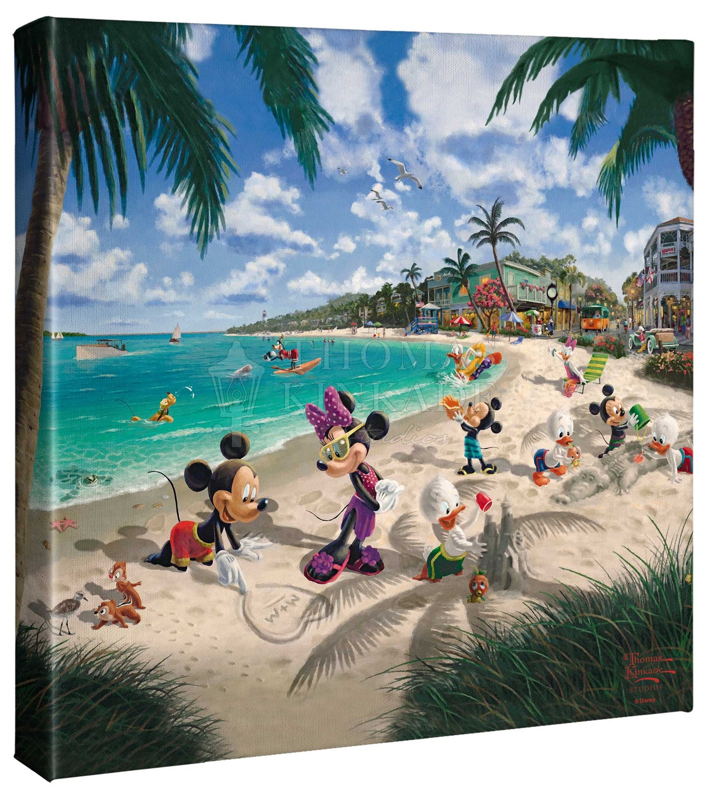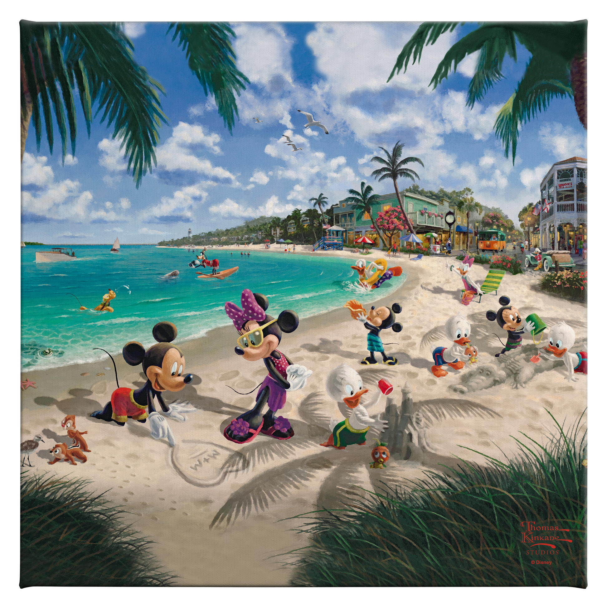 In Disney Mickey and Minnie in Florida by Thomas Kinkade Studios, Mickey Mouse and Minnie Mouse enjoy a warm afternoon on a sandy Key West beach with family and friends. With Daisy Duck’s encouragement, Donald Duck runs out to the ocean, eager to have fun. Goofy tries to keep his balance, standing in his kayak to take a photo of a friendly manatee while Pluto dog paddles back to shore. Morty blows a note through a conch shell as Ferdie, Huey, Dewey, and Louie create architectural masterpieces in the sand, and the curious duo of Chip and Dale ponder the arrival of the sandpiper.Product Specifications