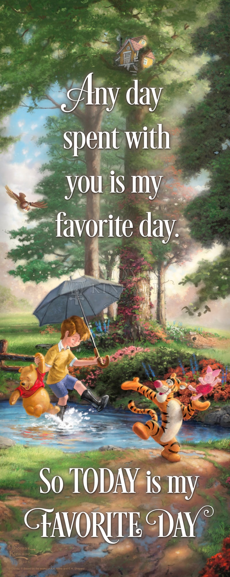nThere are few if any works of literature or animation that better capture the innocence and wisdom of the child and the child's perspective on life than the A. A. Milne classic "Winnie the Pooh". There were few if any books or films that influenced Thom as a young boy more than these stories detailing the adventures of Christopher Robin and his delightful menagerie of friends as they all adventured in the Hundred Acre Wood. In 1966 when Disney Studios began releasing their featurettes chronicling these wondrous tales, Thom could not have been more excited. His childhood fancies were coming to life. It is in honor of that time in his life we at the Thomas Kinkade Studios proudly introduce scenes from this magical story of love, faith, friendship and adventure. It is in these paintings we hope our collectors reflect on and always remember these undeniable truths from Pooh himself, such as "nobody can be uncheered with a balloon" or "when you see someone putting on his Big Boots, you can be pretty sure that an adventure is going to happen."