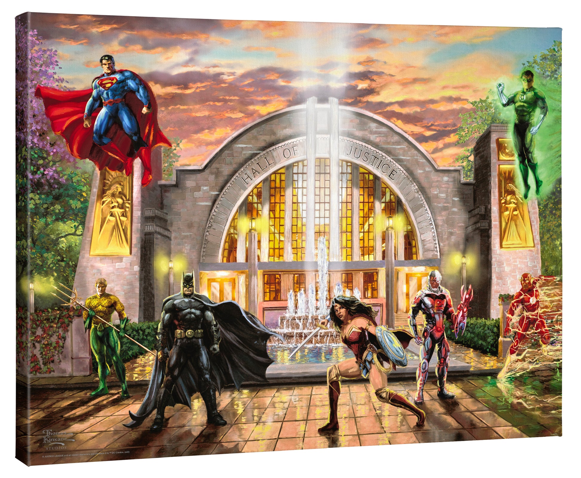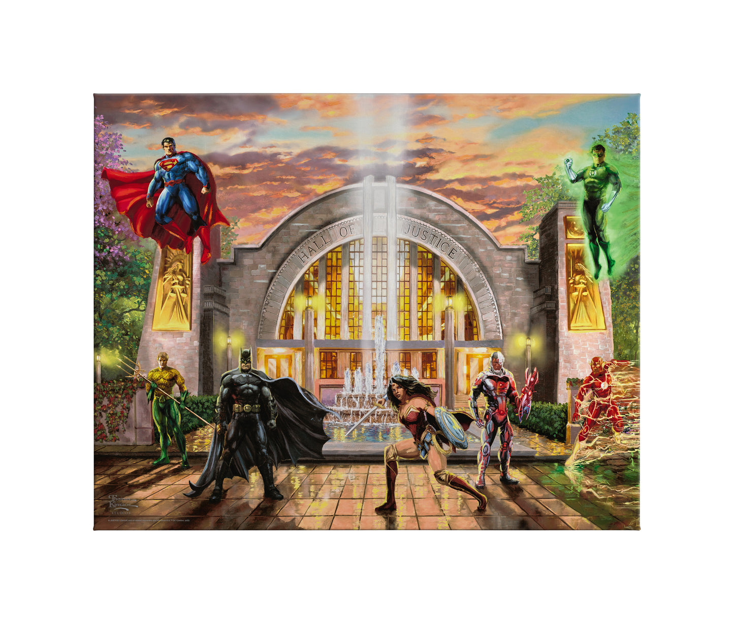 In Hall of Justice by Thomas Kinkade Studios, our intrepid heroes – Batman, Wonder Woman, Cyborg, Aquaman, Green Lantern, Superman, and The Flash – have been called into action. Unified, their incredible superpowers are exponentially stronger, making them virtually unstoppable as they stand ready to protect the world.