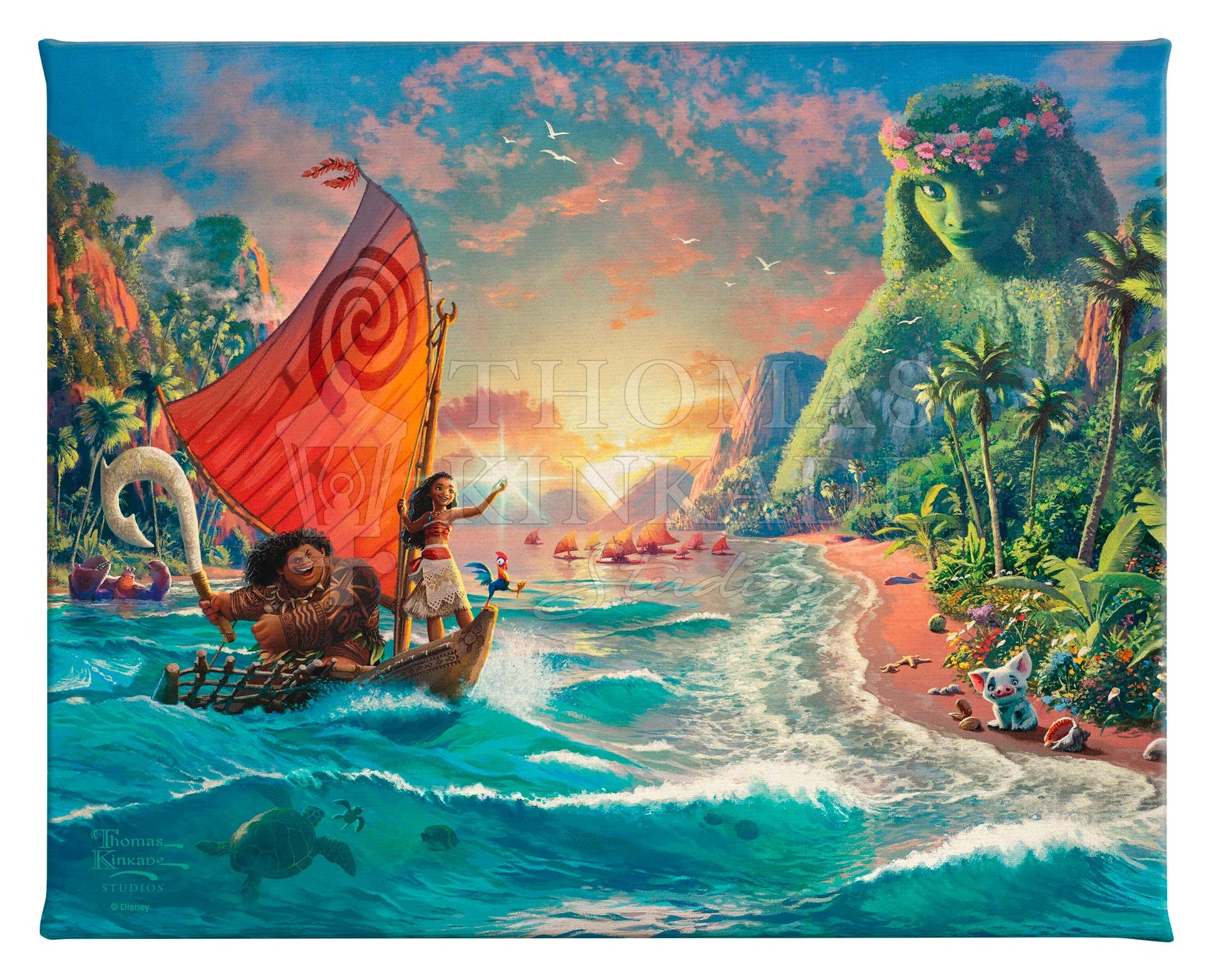 Where does an indomitable spirit come from? Does one have it already within oneself? Is it taught? Disney’s Moana, a courageous young girl who lives on the tropical island of Motunui, feels the pull of the ocean every day of her life. What is her true destiny? Her Gramma Tala has taught all the young ones, including Moana, the tales of their ancestors’ exploits, and the story of how the demigod Maui stole the heart of the goddess Te Fiti. Moana’s father, Chief Tui, does all he can to protect and provide for his people. When the island starts to yield less food for their village, Gramma Tala speaks to Moana, telling her to find Maui so that he can restore Te Fiti’s heart and the life balance of their island. As Moana learns that her ancestors were great sea voyagers, she embarks on one of their boats to follow the hook star constellation leading to Maui. Moana’s sea travels help build the self-confidence she needs to grow into the future Chief she was born to be. Maui and Moana experience dangerous and incredible adventures on their way to restore the heart of Te Fiti. The legend told that Maui must restore the goddess’ heart, but as she realizes her potential and fulfills her destiny, it is a strong and inspiring Moana, with the aid of Maui, who restores Te Fiti’s heart and the island’s balance. Thomas Kinkade Studios is pleased to present Disney Moana, a visual celebration of the story of fulfilling one’s true destiny.
