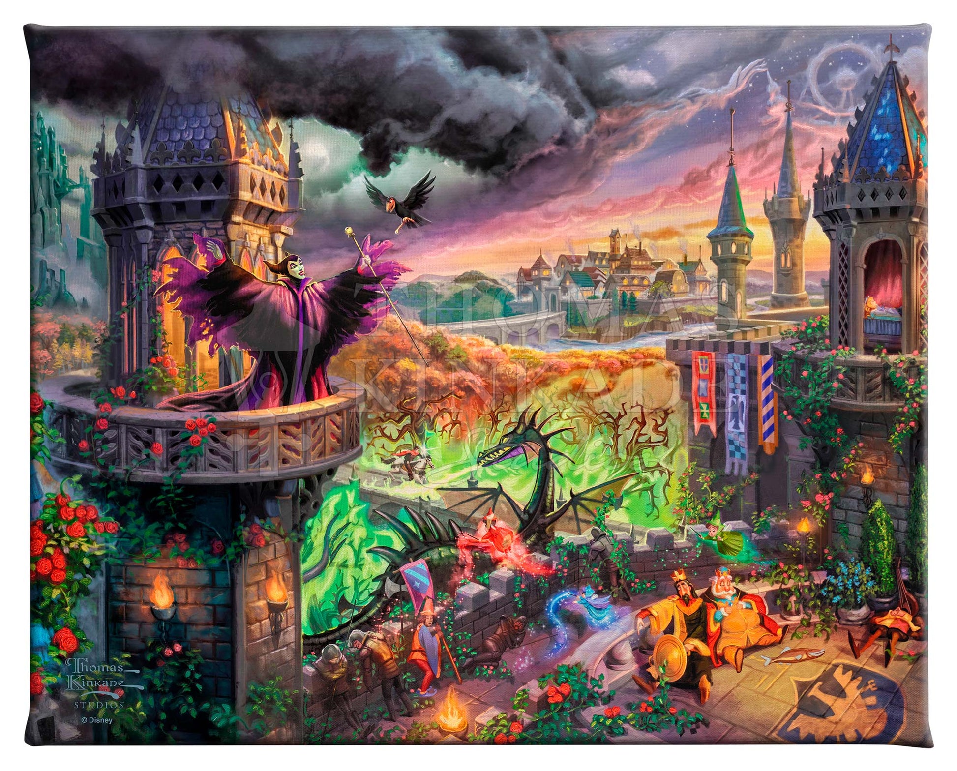 "I really felt quite distressed at not receiving an invitation.” - Maleficent Disney’s Sleeping Beauty has amazing characters that tell a story of how one’s destiny and true love can overcome all barriers, including someone’s animosity. King Stefan has incurred the wrath of Maleficent, the mistress of evil, by having excluded her from the christening of young Princess Aurora. Maleficent has cursed the youngster to an endless sleep by the pricking of her finger on a spinning wheel before her sixteenth birthday. Thomas Kinkade Studios is pleased to present Disney Maleficent, the story of Sleeping Beauty from Maleficent’s point of view after Princess Aurora pricks her finger on an enchanted spinning wheel in the castle tower. Maleficent, with The Raven flying to join her, stands triumphantly on a castle turret overlooking King Stefan and King Hubert who have fallen asleep. Flora, Fauna and Merryweather have snuck into Maleficent’s lair in the Forbidden Mountains to free Prince Philip who races to save Aurora, whose kiss can awaken her from the endless sleep.