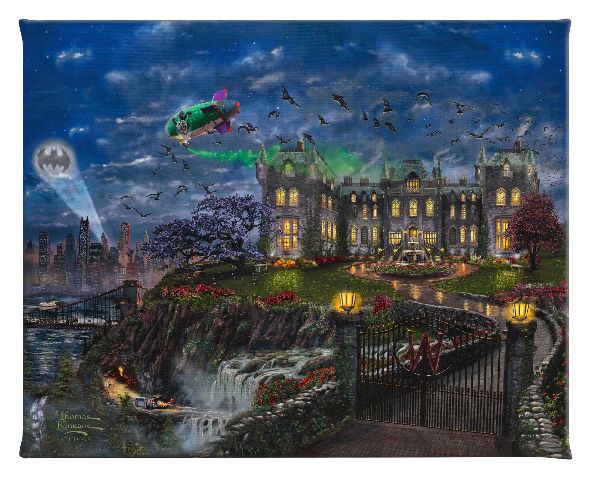Thomas Kinkade Studios' Wayne Manor™ captures the excitement of the moment when the Batmobile™ emerges from the secret entrance below Wayne Manor, responding to the Bat-Signal™. Which arch-nemesis is causing Commissioner Gordon to signal for the Dynamic Duo's assistance? Can Batman and Robin expect to encounter The Joker™, or maybe Ra's al Ghul?