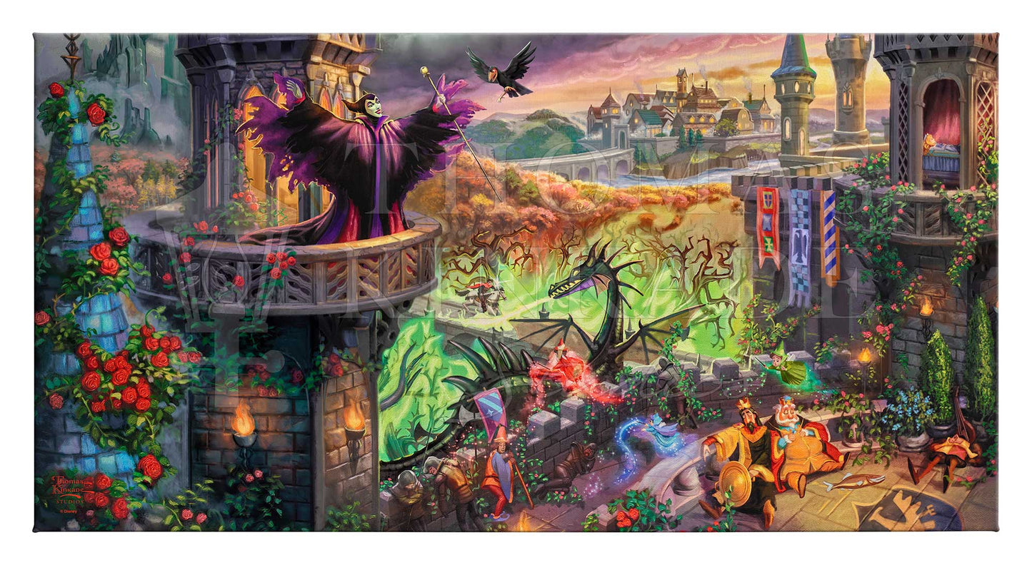 "I really felt quite distressed at not receiving an invitation.” - Maleficent Disney’s Sleeping Beauty has amazing characters that tell a story of how one’s destiny and true love can overcome all barriers, including someone’s animosity. King Stefan has incurred the wrath of Maleficent, the mistress of evil, by having excluded her from the christening of young Princess Aurora. Maleficent has cursed the youngster to an endless sleep by the pricking of her finger on a spinning wheel before her sixteenth birthday. Thomas Kinkade Studios is pleased to present Disney Maleficent, the story of Sleeping Beauty from Maleficent’s point of view after Princess Aurora pricks her finger on an enchanted spinning wheel in the castle tower. Maleficent, with The Raven flying to join her, stands triumphantly on a castle turret overlooking King Stefan and King Hubert who have fallen asleep. Flora, Fauna and Merryweather have snuck into Maleficent’s lair in the Forbidden Mountains to free Prince Philip who races to save Aurora, whose kiss can awaken her from the endless sleep.Product Specifications