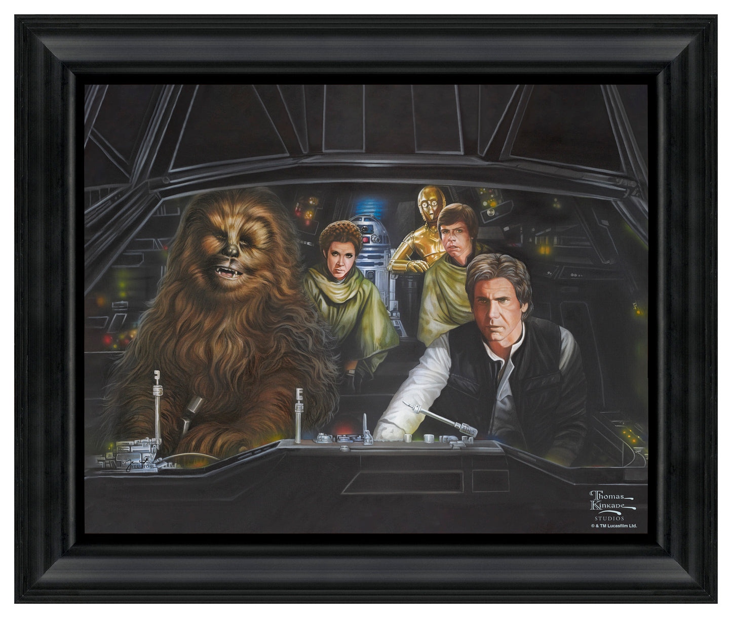 General Han Solo leads a small team of rebels including Chewbacca™, Princess Leia Organa™, Luke Skywalker™, and the Droids, C-3PO™ and R2-D2™ aboard The Tydirium, a stolen Imperial shuttle disguised as a cargo ship. The mission is to use a secret Imperial code, land on the forest moon, and deactivate the shield generator protecting the Death Star. While the team waits to see if the code will work and allow them to land on the forest moon to start their secret mission, the Rebel Alliance fleet starts their journey towards Endor to defeat the Empire and blow up the Death Star. Thomas Kinkade Studios is pleased to present Strike Team.