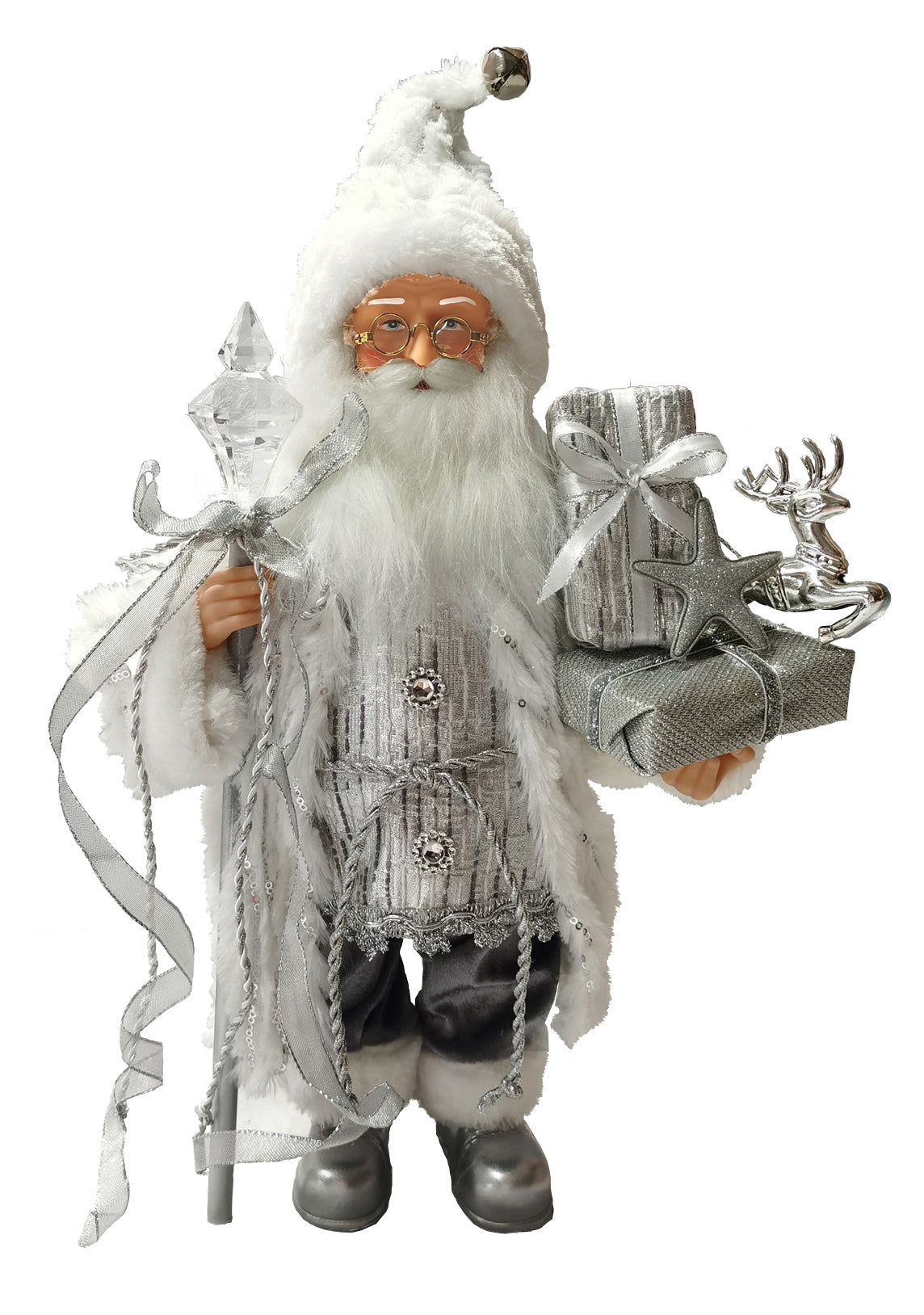 Toss out that old red suit because Santa is taking it up a notch! Santa's new look features a white faux fur jacket and hat with silver highlights, an ornate silver vest and shiny silver boots. He carries a silver staff in one arm and some stylish presents and holiday decorations in the other. With head, hands and boots molded from sturdy resin, this wonderful 15" Silver Gift Bearer Santa will bring fun and delight for many seasons to come.