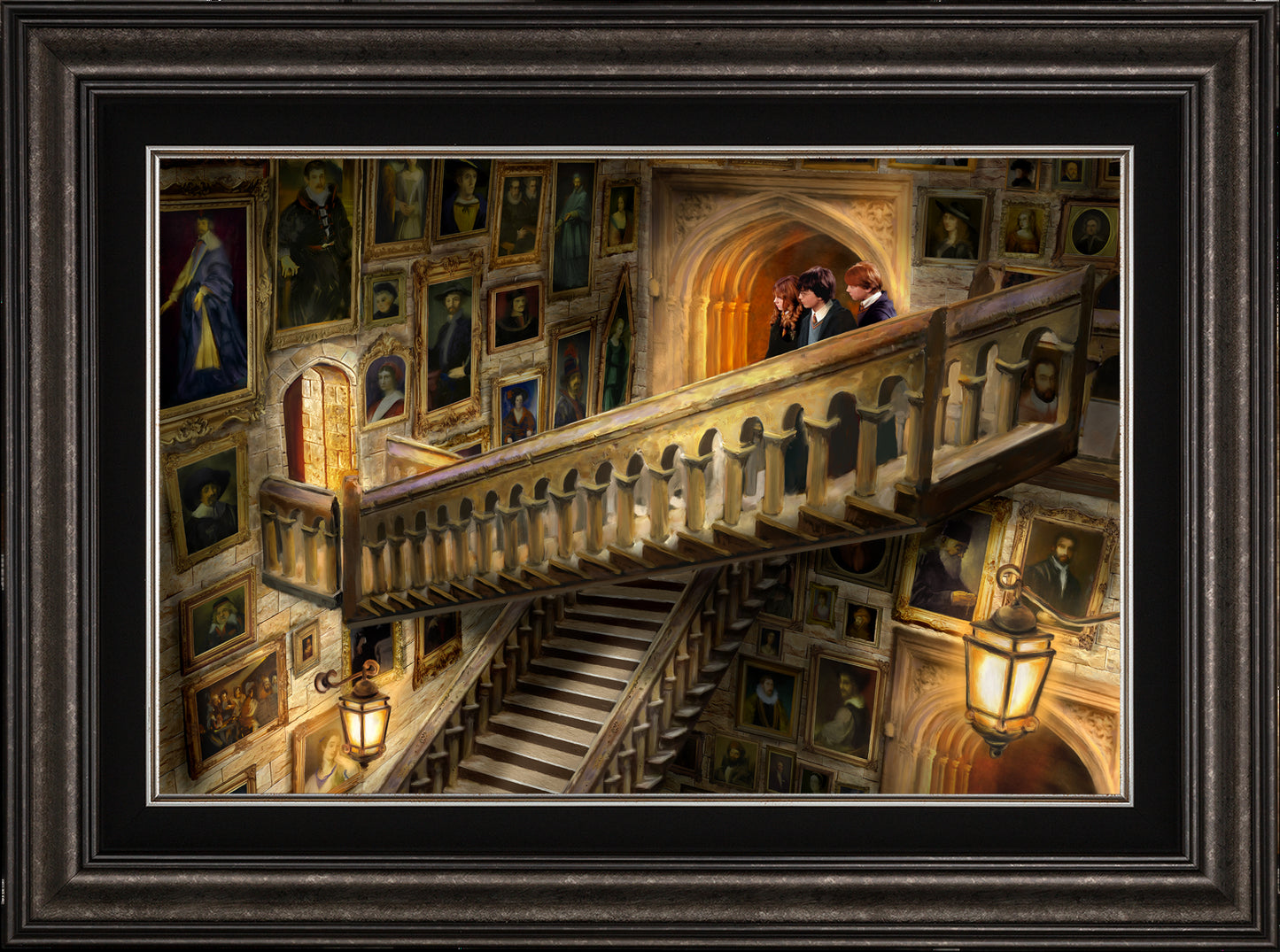 Hogwarts Castle boasts a hundred and forty-two staircases within the many towers, turrets and extremely deep dungeons. The Grand Staircase led from platform to platform and went all the way to the seventh story. New incoming students would learn of the stairs knack for moving around the staircase chamber, and of the many trick stairs they would have to negotiate. Portraits cover the walls, and it’s considered a great honor for the painted likeness of a witch or wizard to be hung on the walls of the Grand Staircase. Join Thomas Kinkade Studios as we climb Harry Potter™ Grand Staircase.