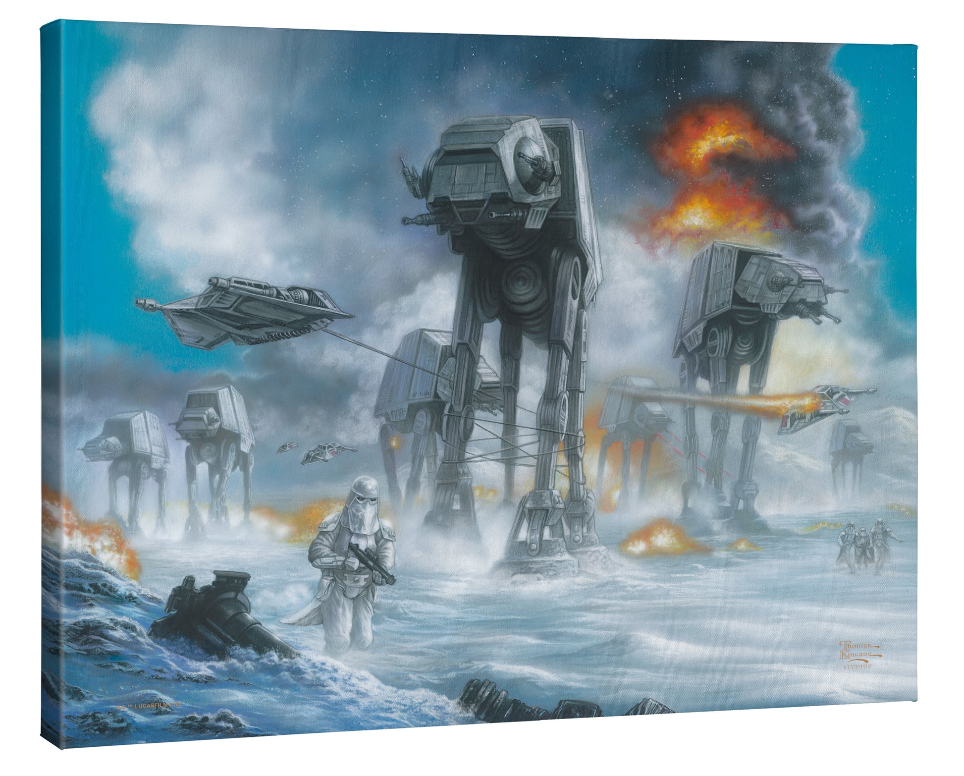 A dramatic depiction of the desperate final moments of the Battle of Hoth as Imperial forces overwhelm the Rebel defenses. The painting captures the iconic battle from Star Wars: The Empire Strikes Back™, showing Imperial AT-AT walkers dominating the snowy landscape. Their imposing mechanical forms tower over the battlefield amid explosions and combat debris. In the foreground, Imperial snowtroopers advance across the icy terrain. Rebel snowspeeders engage the walkers, with one using tow cables to bring down an AT-AT while another fires directly at a walker. The color palette features cold blues and whites of Hoth's frozen landscape, dramatically contrasted with the warm oranges and reds of explosions and blaster fire.
