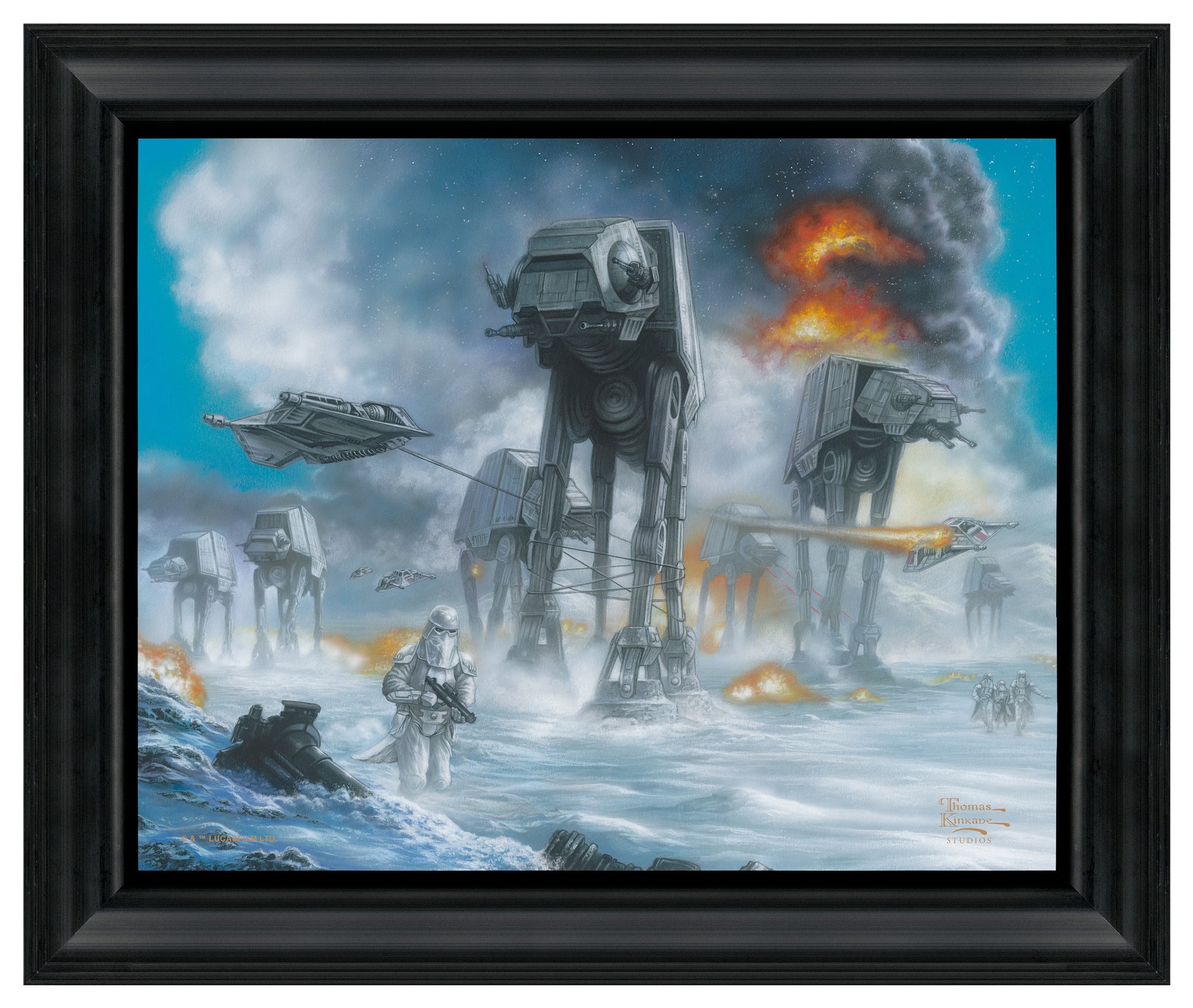 A dramatic depiction of the desperate final moments of the Battle of Hoth as Imperial forces overwhelm the Rebel defenses. The painting captures the iconic battle from Star Wars: The Empire Strikes Back™, showing Imperial AT-AT walkers dominating the snowy landscape. Their imposing mechanical forms tower over the battlefield amid explosions and combat debris. In the foreground, Imperial snowtroopers advance across the icy terrain. Rebel snowspeeders engage the walkers, with one using tow cables to bring down an AT-AT while another fires directly at a walker. The color palette features cold blues and whites of Hoth's frozen landscape, dramatically contrasted with the warm oranges and reds of explosions and blaster fire.
