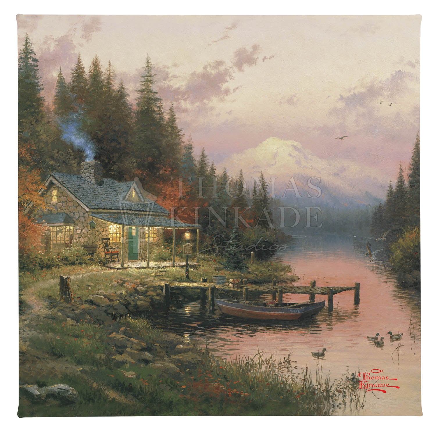 Paintings like The End of a Perfect Day express my growing appreciation for the real beauty of nature untamed. This rustic stone cabin is nestled in a glorious setting a secluded jewel of a lake framed by distant mountains. But my wild places show the charming and comfortable signs of a very human presence. A fireplace warms the living room, illuminating the overstuffed chair and mounted trophy animals glimpsed through open windows. That is my ideal way to end a perfect day. © The Thomas Kinkade Estate – All Rights ReservedProduct Specifications