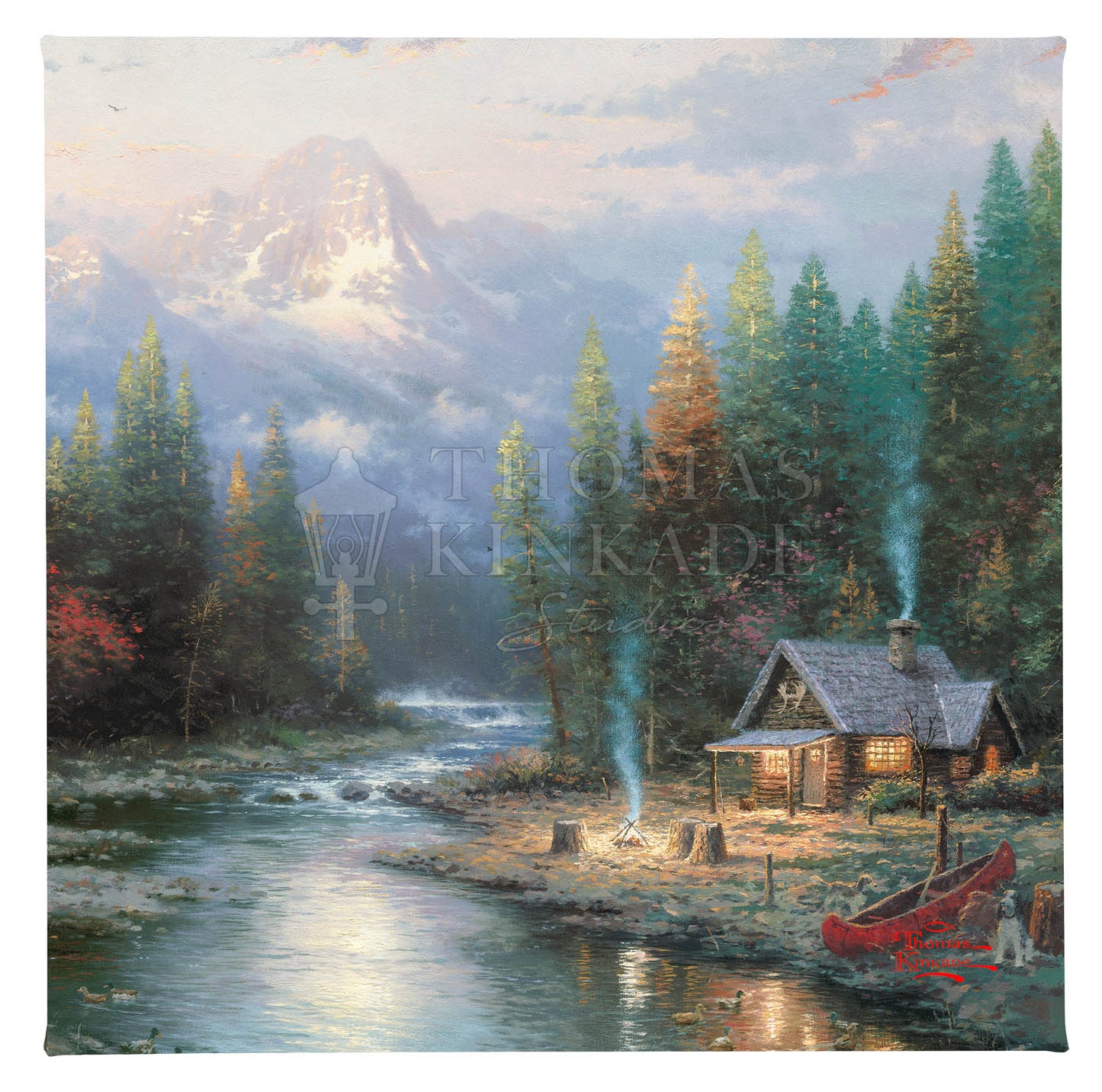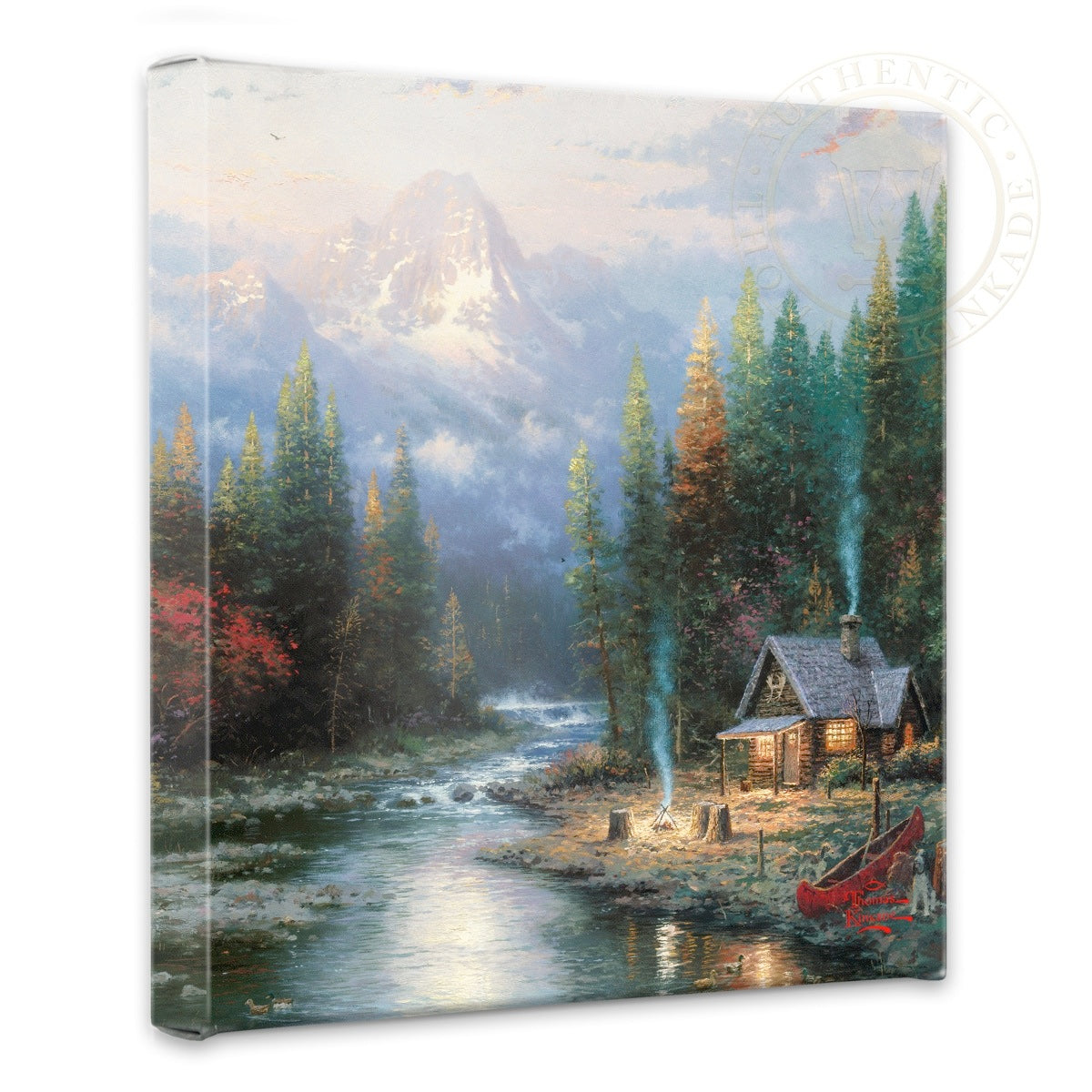 In A Quiet Evening at Riverlodge, second in my End of a Perfect Day collection, we visit a cozy, rustic cabin nestled in a setting rich with natural drama. A campfire stands at the ready; soon a company of weary fishermen will gather about the fire, swapping outlandish stories about the one that got away. Now that truly is the perfect end to a perfect day! © The Thomas Kinkade Estate – All Rights ReservedProduct Specifications