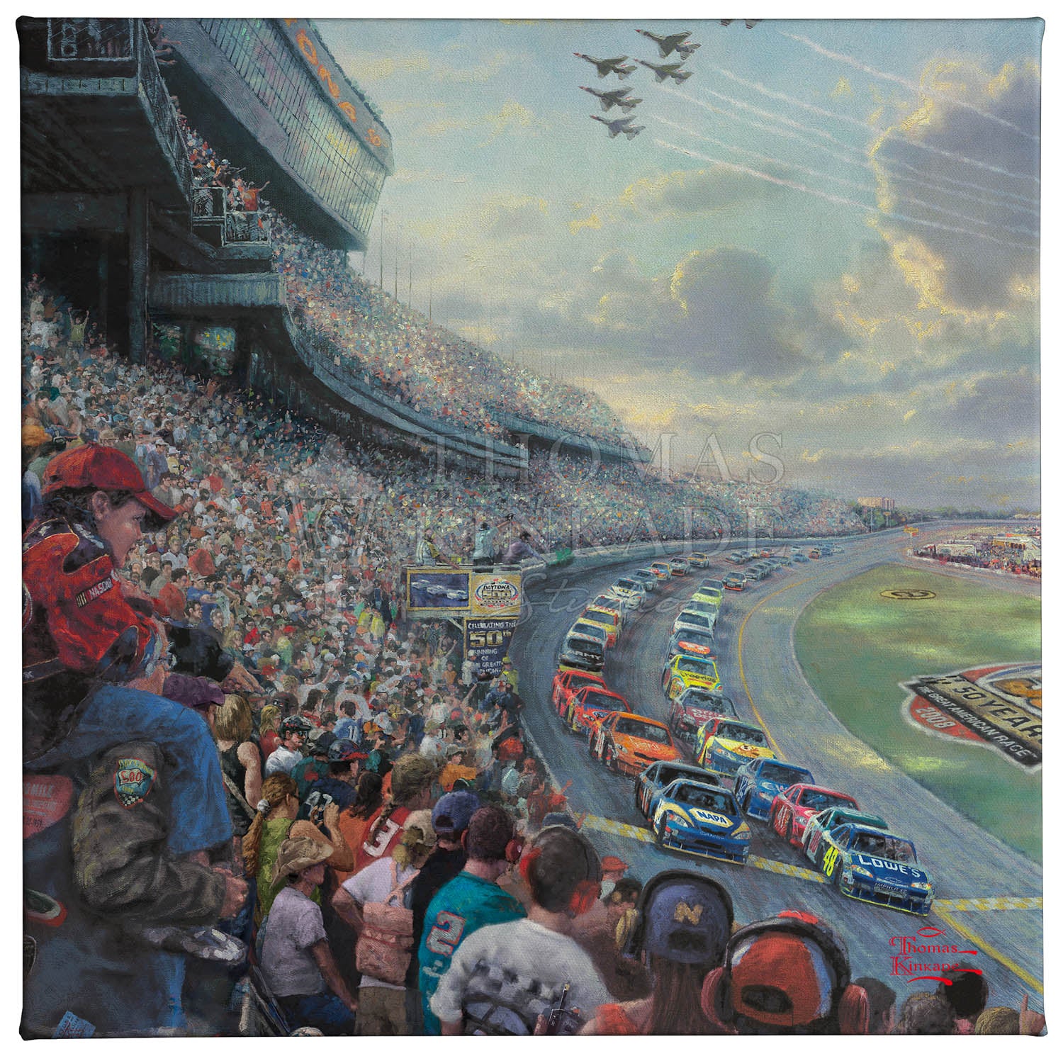 The race is off! In the foreground, 43 mighty race cars thunder by as "The King" himself, Richard Petty, waves the green flag for the start of the 50th Running of the DAYTONA 500®. As I paint furiously, the electricity and spectacle of the moment is almost overwhelming. In my Studio Masterwork release of the "Great American Race" I intend to capture the power of the starting moment, while honoring this one-of-a-kind NASCAR® event. I have always believed that a painting can capture the pageantry and energy of historic events like no other medium, and my goal as I painted NASCAR® THUNDER The 50th Running of the DAYTONA 500® was to document this classic event for race fans everywhere.