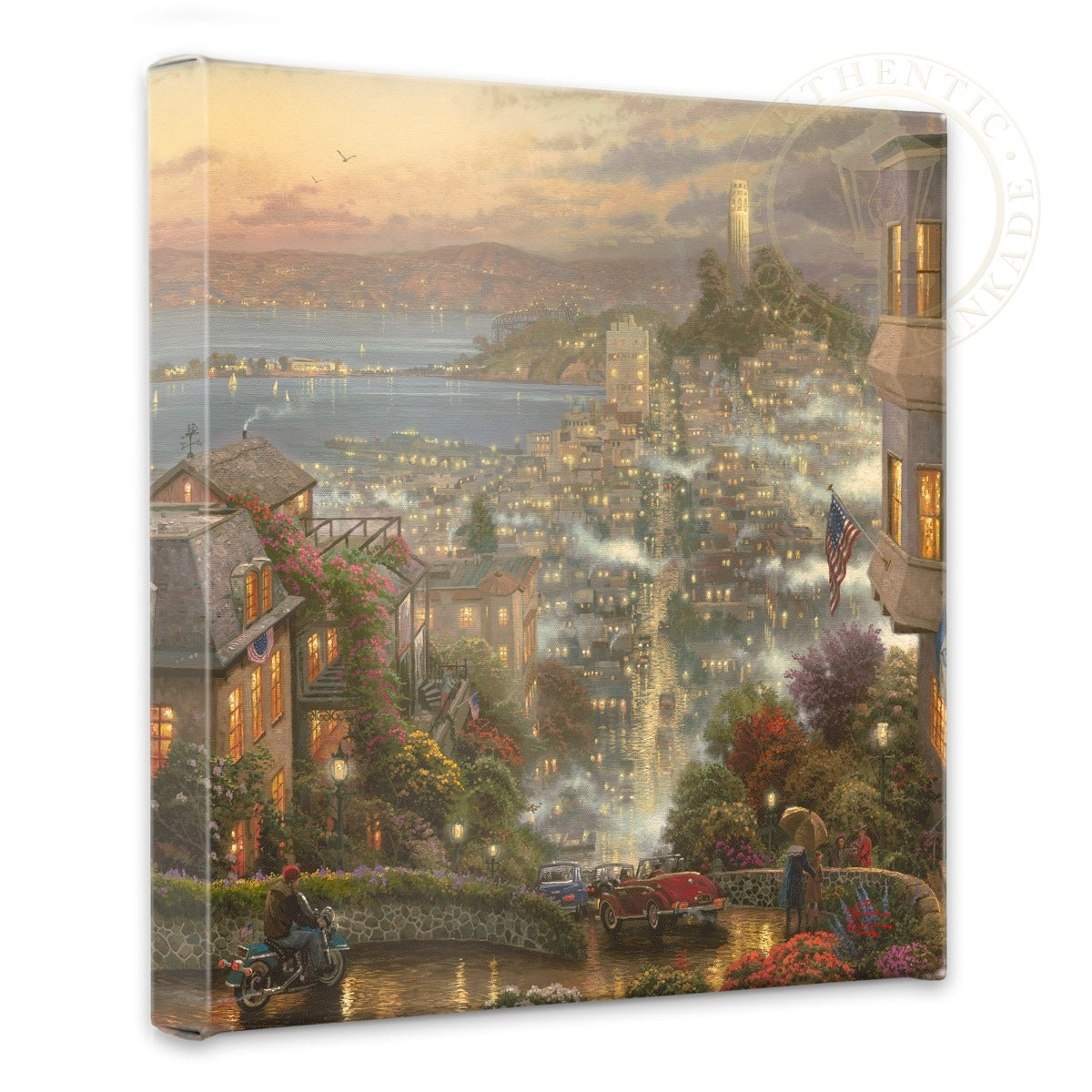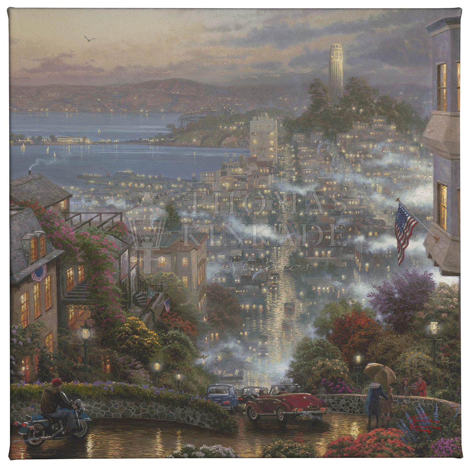 This is a golden evening; the warm glow of sunset banishes the mist and paints the busy street with its cheerful light. The exuberance of city life is everywhere evident. On Lombard Street, on an evening such as this, life is a gala celebration of the endless possibilities of city life. I invite you to celebrate with me. © The Thomas Kinkade Estate – All Rights Reserved