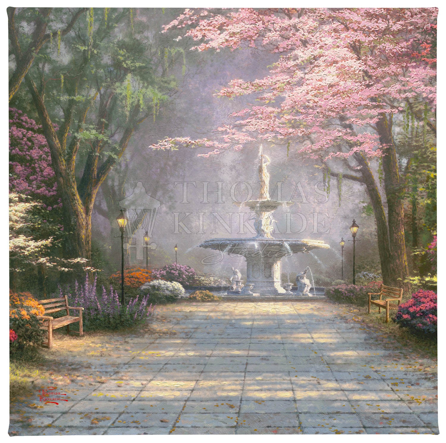 Savannah, Georgia has always been a city for romantics. And the crown jewel of this gracious southern city epitomizes all that is the Old South. Forsyth Park remains one of the most visually abundant locales in all of Savannah. In my painting, Savannah Romance, I've paid homage to the majestic Forsyth Fountain. I've also included an abundance of color - dogwood and mimosa trees vie for attention with resplendent southern magnolias and lush azaleas. Whether you've been to Savannah, or simply long to visit, may Savannah Romance truly bring out the dreamer's heart in all of us. © The Thomas Kinkade Estate – All Rights Reserved