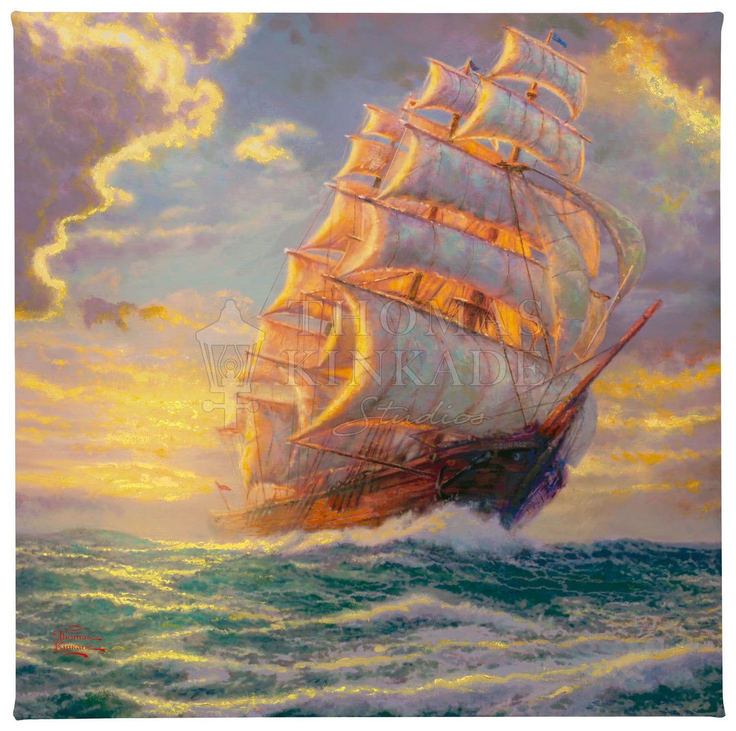 As I set my brush to canvas, I could not envisage a better tribute to courage and hope, than a lone clipper ship defiantly pushing through the ocean's fury against the backdrop of a clearing sky radiant with hope and light. I have always had a great respect for the clipper ship artists of the past for whom the sea represented the only connection to a new world and promises of a new day. Courageous Voyage is as much a tribute to a man like Montague Dawson whose early images of the sea inspired me, as it is a message to those mired in challenge and praying for opportunity and new beginnings. I trust that this image will encourage you to face the swells of life with a profound courage secure in the hope, instilled through providence and faith, that tomorrow is in His hands...that the storm is clearing...that the sun is ushering in a vibrant new day...and that your Courageous Voyage has set you upon the tides of remarkable ventures.