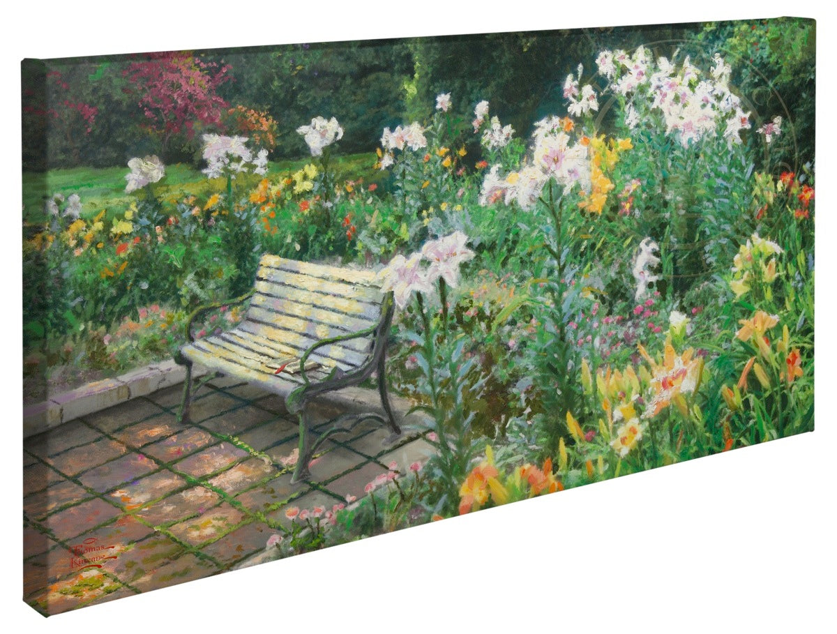 Thom, as a routine, would carve out a few minutes in the day to find an outdoor venue filled with sunshine to read his Bible or a book. This "mini-vacation" would be a time of refreshment and reflection for him amidst a very busy schedule. Eternal Springtime depicts the perfect place to recharge and disconnect from daily life - if only for ten minutes. One cannot help but smell the sweet fragrance of the lilies or feel the warmth from the sun shining onto the weathered bench when viewing this piece. This is a serene resting place where peacefulness reigns and the hope that springtime signifies is painted into every stroke. The scientific word for daylily is Hemerocallis, which is derived from two Greek words meaning "beauty" and "day". It isn't any surprise that Thom added a plethora of blooming daylilies in his painting. Each lily bloom only lasts one day, but each stalk holds many blossoms that will bloom each day for many weeks, providing beauty into the future. The hope of each new day made anew, is the allure found in Eternal Springtime. Eternal Springtime was to become Thom's final painting as it was found resting on his well-worn easel. No doubt, he would be pleased in knowing that this piece might inspire you to carve out a few moments in your busy day to indulge in his vision of peacefulness, beauty, and serenity. Our hope is that this painting will serve as a reminder to you in finding a few moments of peace and reflection and that you may find refreshment upon viewing it just as Thom did while sitting in sunshine. © The Thomas Kinkade Estate – All Rights ReservedProduct Specifications