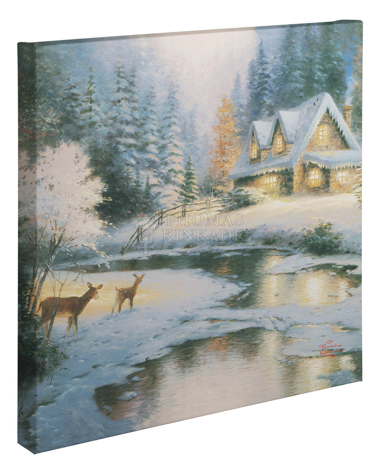 In Deer Creek Cottage the world seems reborn in beauty, all the barrenness of the winter wood hidden by white. The delicate fawn, peering at the lights in the cottage windows, seem to join in the reverent mood. Perhaps even the animals of the forest can celebrate Christmas! © The Thomas Kinkade Estate – All Rights ReservedProduct Specifications
