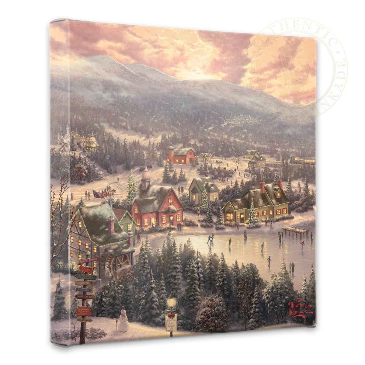 Twenty years have passed since Thomas Kinkade first set in oil his cherished winter masterpiece, St. Nicholas Circle. Moved by the architecture and atmosphere of New England, Thom lovingly crafted the first image in this collection as he enjoyed the opportunity to paint in the studio of his long time "hero in art", Norman Rockwell. But the scope of Thom's vision stretched well beyond what could be held in on a single canvas. As Thom himself said, "St. Nicholas Circle is simply the first stop in a world where the joy of Christmas never leaves and the spirit of the season abides in every heart." Just a snowball's throw from St. Nicholas Circle, we can see Sunset on Snowflake Lake. The snowy wonderland is decorated for Christmas with the town's residents skating, sleighing, making a snowman and enjoying a fresh blanket of snow. As the sun sets early in the winter, the rose-colored sky highlights a train passing through the snowy mountain-scape on its way to deliver travelers to loved-ones for the holidays. The familiar signpost in the foreground marks the way to other wonderful places, and future canvases, where Christmas is celebrated year 'round. Sunset on Snowflake Lake is the second heart warming image in The Legend of St. Nicholas Circle collection. © The Thomas Kinkade Estate – All Rights ReservedProduct Specifications