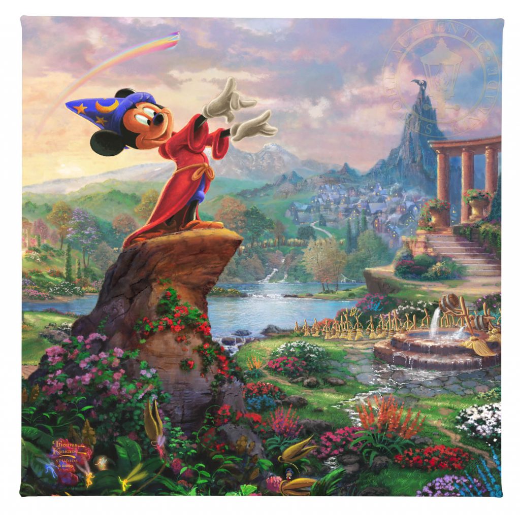 Walt Disney so famously reflected on his career and legacy "it was all started by a mouse", which indeed it did. From those simple beginnings in the classic cartoon Steamboat Willie, the "mouse" has grown to an iconic stature on the worldwide stage and clearly reached a very celebrated peak in the animated masterpiece Fantasia as the sorcerer's apprentice. Never before and truly never since has there been a more ambitious and successful fusion of high art, classical music and popular culture in film. Fantasia was a revolutionary film leaving an emotional, intellectual and spiritual impact on its viewer. It is from this lofty platform of visionary brilliance and excellence in artistic execution that the Thomas Kinkade Studios began its rendering of Fantasia. Joining the flowers and fairies are many delightful characters from various segments of this Disney classic. Mickey stands in the center of it all orchestrating the sublime dance going on about him. One can almost hear the strings, brass and timber of Leopold Stokowski's Philadelphia Orchestra spring to life while viewing this masterwork of color, light and animated composition. Indeed, it may have all started with a mouse but in Fantasia it has never been more clear that this simple fellow of humble beginnings has become so much more. Fantasia as a film is transcendent, fully taking the mouse to the level of high culture. We at Thomas Kinkade Studios hope you will all agree that our interpretation of Fantasia is yet another extension of the film's tradition of exploring beauty through the purity of joyous artistic expression. © Disney © The Thomas Kinkade Estate – All Rights ReservedProduct Specifications
