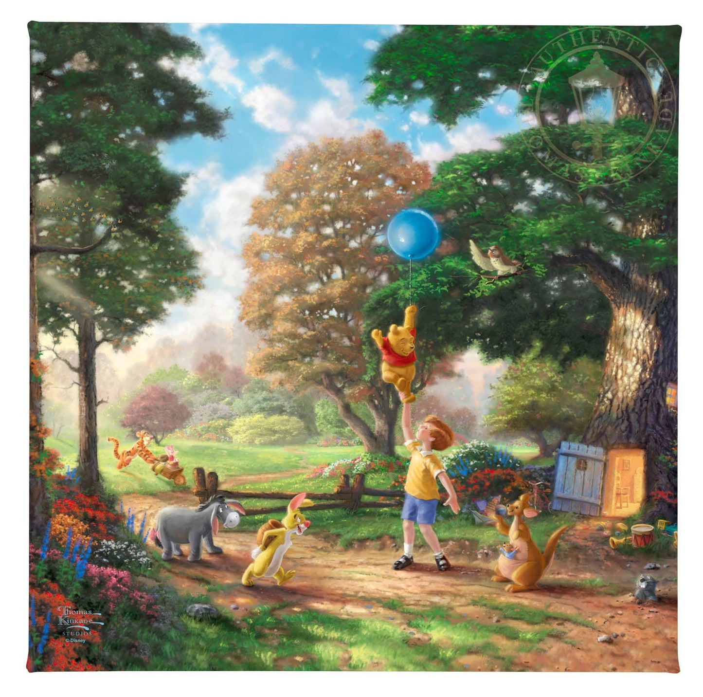 There are few if any works of literature or animation that better capture the innocence and wisdom of the child and the child's perspective on life than the A. A. Milne classic "Winnie the Pooh". There were few if any books or films that influenced Thom as a young boy more than these stories detailing the adventures of Christopher Robin and his delightful menagerie of friends as they all adventured in the Hundred Acre Wood. In 1966 when Disney Studios began releasing their featurettes chronicling these wondrous tales, Thom could not have been more excited. His childhood fancies were coming to life. It is in honor of that time in his life we at the Thomas Kinkade Studios proudly introduce scenes from this magical story of love, faith, friendship and adventure. It is in these paintings we hope our collectors reflect on and always remember these undeniable truths from Pooh himself, such as "nobody can be uncheered with a balloon" or "when you see someone putting on his Big Boots, you can be pretty sure that an adventure is going to happen."© Disney