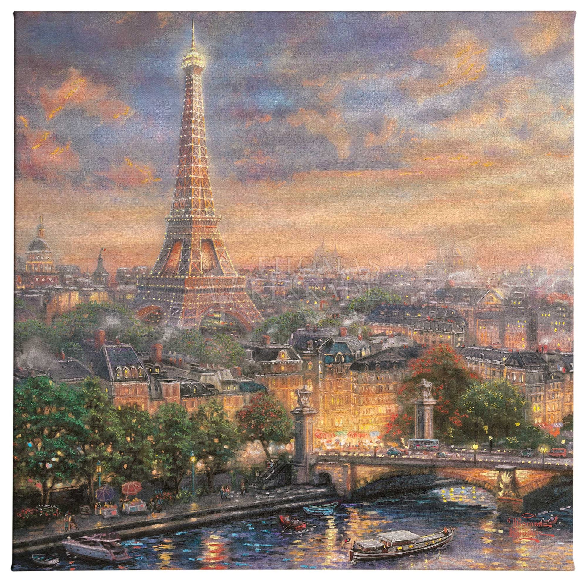 Paris, City of Love. The most romantic city in the world. A place where starry-eyed lovers stroll hand-in-hand along the River Seine or linger in sidewalk cafes speaking French, the "language of love." A city whose beauty strikes us at every corner, with its elegant architecture, iconic monuments, and the subtle combination of art, history and nature, creating the perfect canvas on which love can be conceived and painted into its own masterpiece. Standing above the city is the most romantic of places, the Eiffel Tower. With its glittering lights illuminating the birth of evening, couples share romantic moments, wedding engagements and honeymoons, that create memories that will last an eternity. Thomas Kinkade loved Paris, and the great tradition of artists and work that have flowed from its studios for centuries. He painted it often, always capturing its magnificent surroundings and that romantic "magic" in the air. The Thomas Kinkade Studios presents a romantic vision of Paris. Find yourself strolling with someone you love down its streets or through this canvas masterpiece, and you will understand why Paris is called, the City of Love. © The Thomas Kinkade Estate – All Rights Reserved