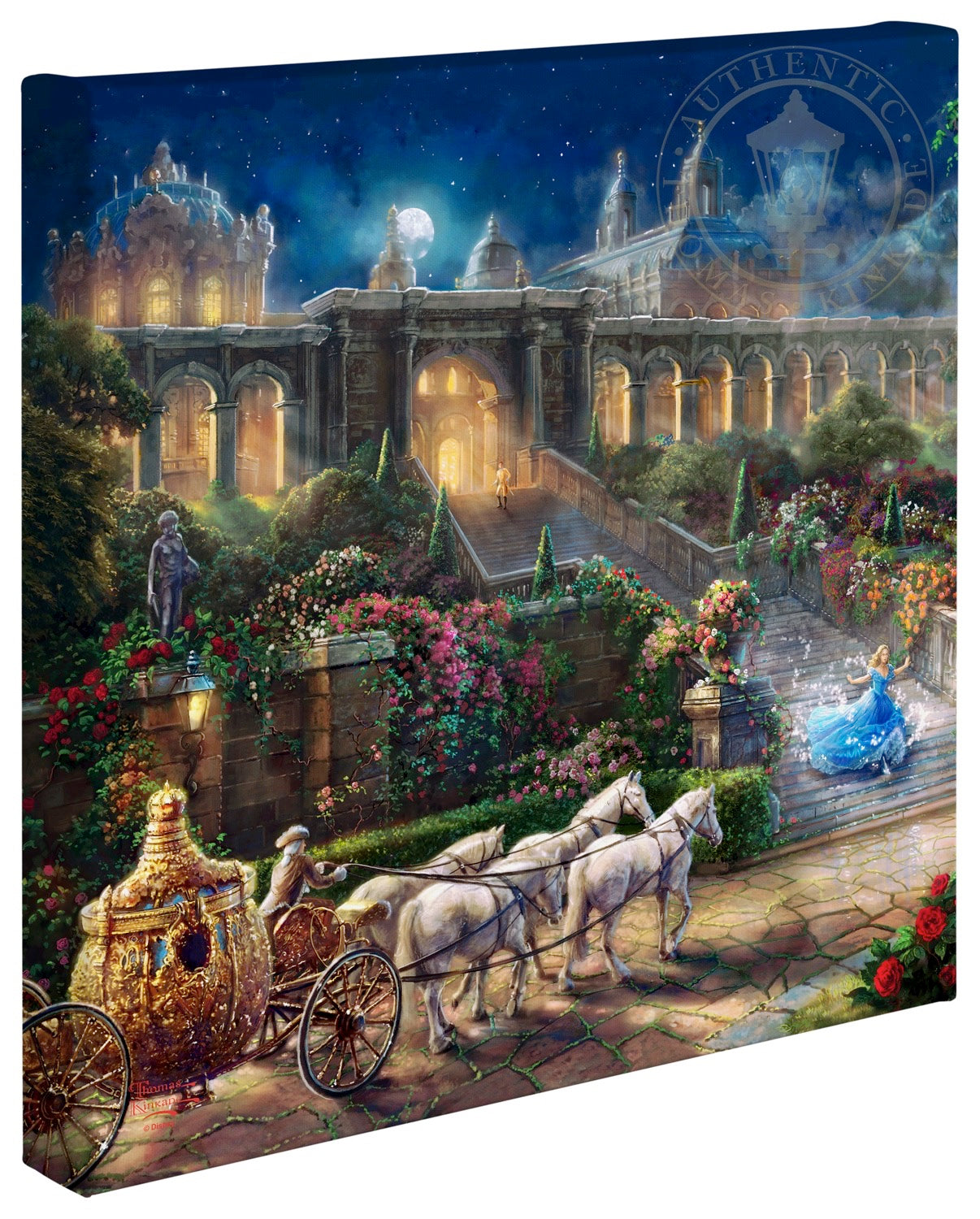 The story of "Cinderella" is a timeless and universal tale of romance and self-discovery. It explores the importance of inner beauty in the assessment of personal worth and proclaims the power of true love to overcome all obstacles no matter how large and daunting they may seem. The folklore of the hidden princess magically discovered by her true prince has been told for hundreds of years in countries throughout the world as geographically and culturally diverse as Malaysia and Germany. The beauty of the fable and the importance of its message have also made it a constant in the list of favorite stories told and enjoyed by those spinning yarns in our own country. To be sure, Thom loved the original "Cinderella" as much as any and would speak of it fondly when reminiscing of story-times spent with his own beautiful daughters. Their laughter and delight at his telling would shine in his own eyes as he reveled in their obvious enchantment. We at the Thomas Kinkade Studios are excited to continue in this storytelling tradition, bringing to life the latest Disney retelling of this classic story in the form of four paintings; each capturing in oil the joy of first love, the wonderment of fairy magic and the excitement of romantic adventure. Whether you are enjoying the encounter with the dashing stranger in the woods, the depiction of Cinderella's enchanted transformation, her flight from discovery at the King's ball or her time in love with the prince of her dreams, all of these masterworks in color and light will dazzle your eye and speak to your heart. It is our hope that this latest interpretation of "Cinderella" be a gift not only to all "princesses" but also to all those who love them. © Disney © The Thomas Kinkade Estate – All Rights ReservedProduct Specifications