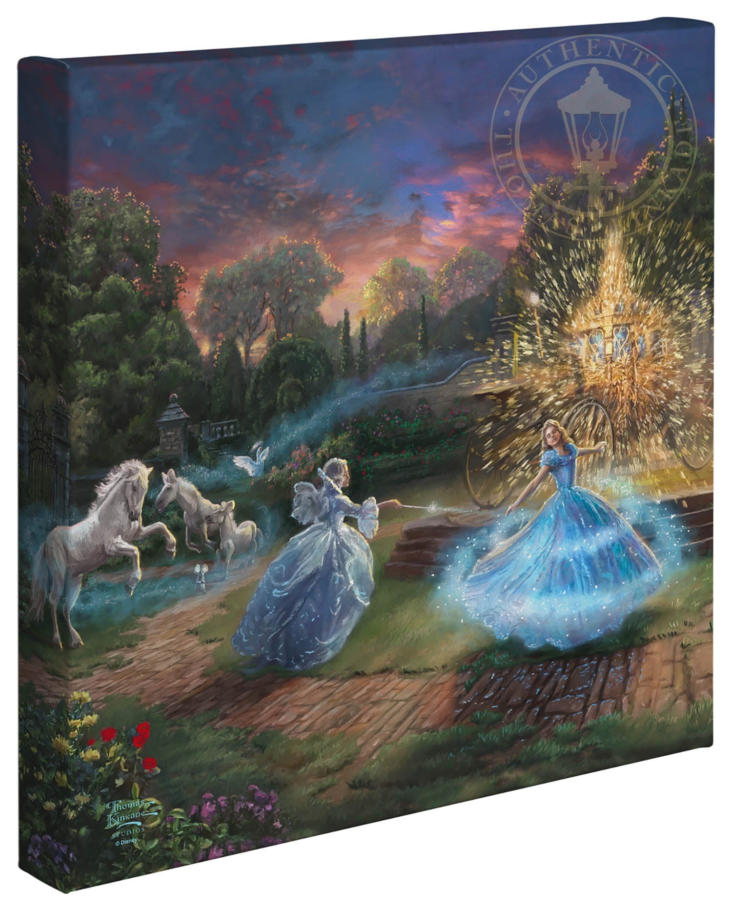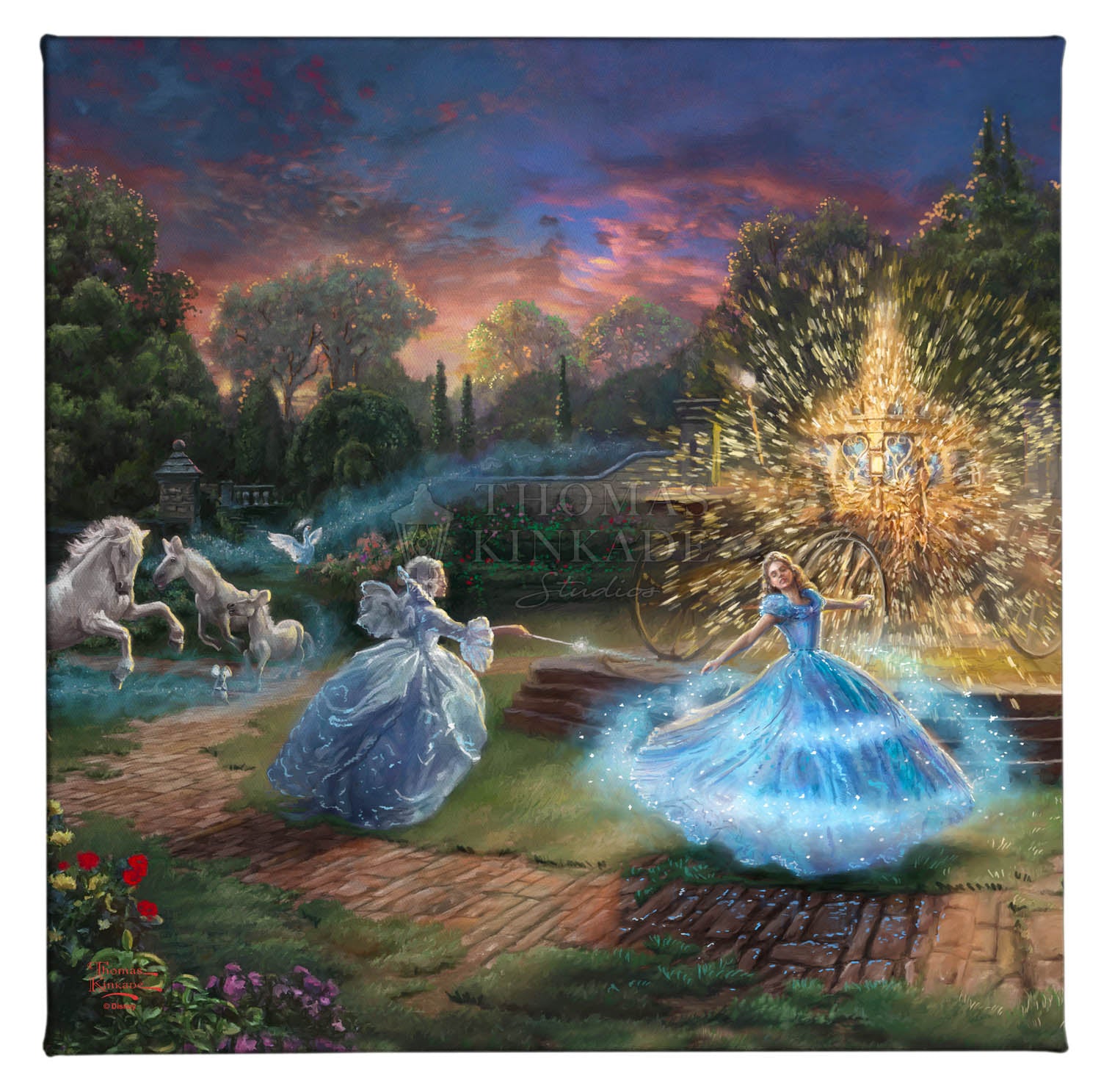 The story of "Cinderella" is a timeless and universal tale of romance and self-discovery. It explores the importance of inner beauty in the assessment of personal worth and proclaims the power of true love to overcome all obstacles no matter how large and daunting they may seem. The folklore of the hidden princess magically discovered by her true prince has been told for hundreds of years in countries throughout the world as geographically and culturally diverse as Malaysia and Germany. The beauty of the fable and the importance of its message have also made it a constant in the list of favorite stories told and enjoyed by those spinning yarns in our own country. To be sure, Thom loved the original "Cinderella" as much as any and would speak of it fondly when reminiscing of story-times spent with his own beautiful daughters. Their laughter and delight at his telling would shine in his own eyes as he reveled in their obvious enchantment. We at the Thomas Kinkade Studios are excited to continue in this storytelling tradition, bringing to life the latest Disney retelling of this classic story in the form of four paintings; each capturing in oil the joy of first love, the wonderment of fairy magic and the excitement of romantic adventure. Whether you are enjoying the encounter with the dashing stranger in the woods, the depiction of Cinderella's enchanted transformation, her flight from discovery at the King's ball or her time in love with the prince of her dreams, all of these masterworks in color and light will dazzle your eye and speak to your heart. It is our hope that this latest interpretation of "Cinderella" be a gift not only to all "princesses" but also to all those who love them. © Disney © The Thomas Kinkade Estate – All Rights ReservedProduct Specifications