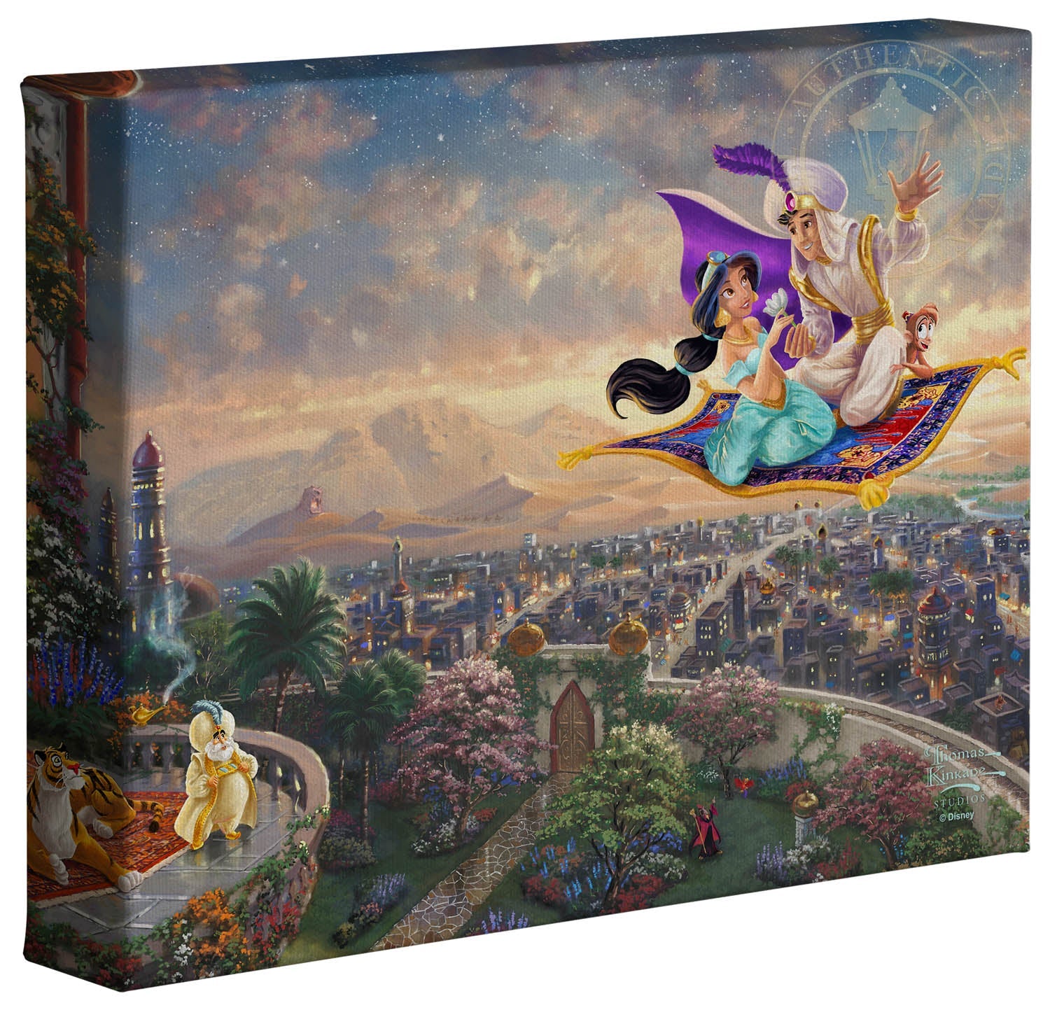 Who am I? And with whom will I share a lifetime of love? These are two of the great themes of each of our lives; questions we seek to answer in our own life's journey. In Disney's magical animated classic, Aladdin, based on the folktale "Aladdin, or the Wonderful Lamp" from the collection "One Thousand and One Nights", both Aladdin and Jasmine seek answers to these two great questions. The peasant boy Aladdin pretends to be a prince to win the hand of his beloved Jasmine, and Princess Jasmine pretends to be a peasant to break the confines of her palace home. As they soar above Agrabah and the surrounding kingdom on a magic carpet ride, they discover a "whole new world" of adventure and love, and the realization that we only need "to be ourselves", not someone else, to find "true love" and that wondrous place for you and me. Thomas Kinkade Studios is proud to present Aladdin with the hope that you too will discover that wondrous place and love for your life. © Disney © The Thomas Kinkade Estate – All Rights ReservedProduct Specifications
