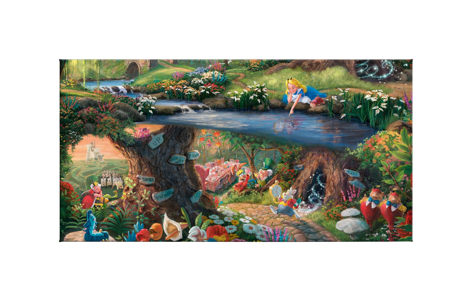 The story tells of a young girl named Alice who accidentally falls down a rabbit hole and finds herself on a curious adventure and in the presence of a number of odd and interesting characters. In 1951, Walt Disney realized a long-held ambition and brought this enchanting tale to the big screen, infusing it with his own brand of animated magic and family fun. Alice in Wonderland as illustrated by John Tenniel was exquisitely detailed in the book, while the Disney film was a modernist style with a highly saturated color palette. The Thomas Kinkade Studios painting of Alice in Wonderland captures all the great Disney characters. The hurried White Rabbit, the enigmatic Caterpillar, the lunatic Mad Hatter, the nonsensical Tweedledee and Tweedledum all play a part in the world down the hole. There is also Alice, viewing it all with a child's innocence and relating to it in a way that brings out the wonderment in all of us. It is with a great deal of pride that we present the Thomas Kinkade Studios painting Alice in Wonderland inspired by the literary genius of Lewis Carroll and animated mastery of Walt Disney. © Disney © The Thomas Kinkade Estate – All Rights ReservedProduct Specifications